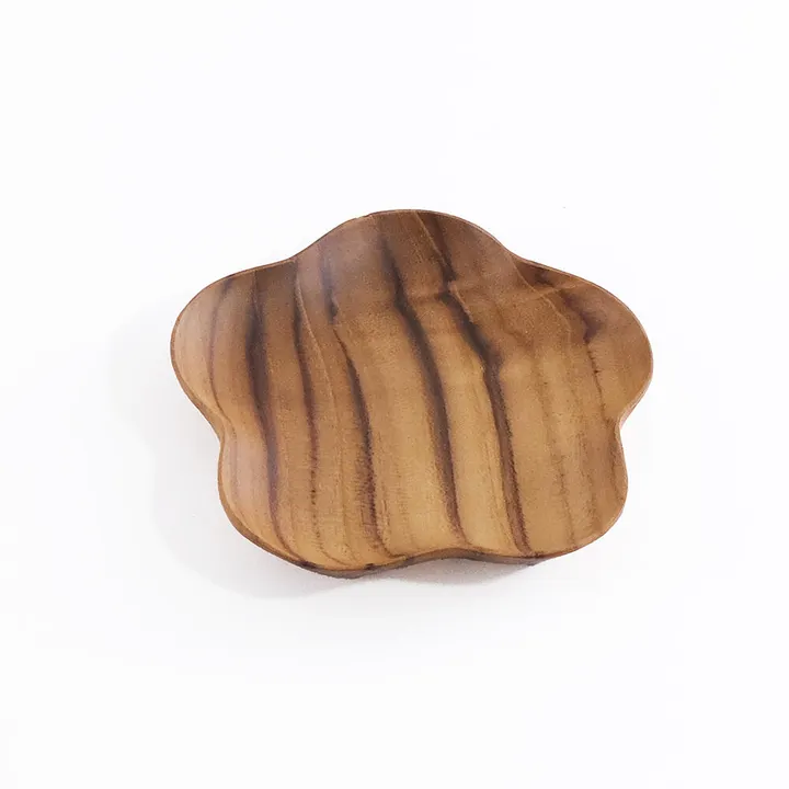 手触りが良く高級感のあるチークウッドで作ったふんわり和モダンなつぼみ形のプレートです。 天然木の温もりを生かした丁寧に手作りでつくられたこのプレートは、チークウッドのなめらかな質感と軽い持ち心地が特徴です。 つぼみ形のデザインは食材を美しく引き立てると同時に、食卓をより華やかなものにしてくれます。 思わず誰かにみせたくなる可愛さで、ちょっとしたおかずのほか、お茶やコーヒーに添える菓子皿としてやお酒のおつまみを入れるのにも丁度良いサイズ感です。 食卓の上だけでなく、指輪やピアスなどのアクセサリーや文房具をいれる小物入れとしてもピッタリで、ついつい収集したくなる豆皿です。