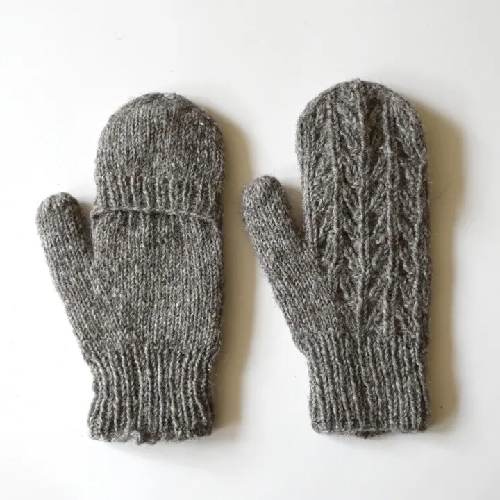 アラン模様が美しいミトン。今季は木漏れ日をイメージして木のような模様を。カジュアルにはもちろん、きれいめコーデにも。指先カバー付きで指が出せる仕様で便利。コットンライナー付。