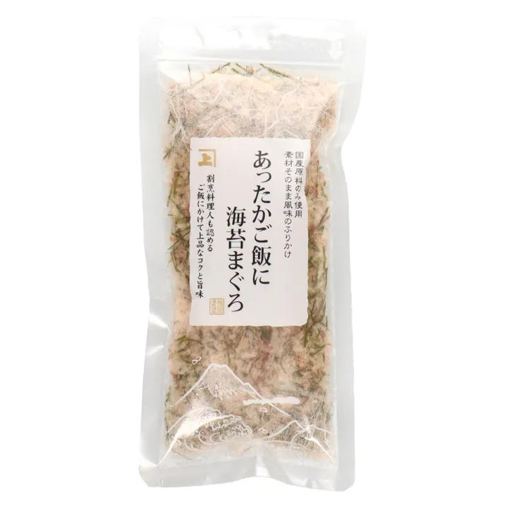 ーーー 【送料に関して】 商品合計が「60袋以上」もしくは「2ケース以上」で送料は弊社負担となります。(北海道・沖縄は除く) ーーー 鹿児島県産のまぐろ枯節に焼き刻み海苔をあわせた無添加ふりかけ。 味付けはしていません。 まぐろ枯節の上品で淡白な旨味がご飯やお料理の「あまみ」を引き出してくれる贅沢なトッピング。 お好みでお塩やお醤油をふりかけて。 ●栄養成分(100g当り) 熱   量:325kcal タンパク質:77.3g 脂   質:1.8g 炭 水 化 物:6g 食塩相当量:1.4g ●特徴 「あったかご飯に」シリーズのふりかけには食塩や砂糖、調味料は一切使用しておらず味付けをしていません。そのため、お召し上がりの際にはお好みでお醤油やお塩をかけてお召し上がりください。