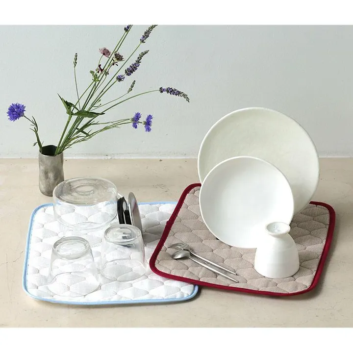 吸水性と速乾性が魅力のかや。 洗った食器やカトラリーを置く水切りマットができました。 例えばお風呂あがりに水を飲んだグラスなど 少ない量の洗い物も、 さっと洗って置いておけるので便利です。 平置きなので、食器を拭くときもスムーズ。 食器を仕舞ったあとは吊るしておけば、あっという間に乾きます。 生乾きのイヤな臭いが食器に付かず気持ちよく快適! 畳んだり丸めて収納できるので水切りカゴのように場所をとらず 省スペースでキッチンもスッキリ。 ※パイピングの太さが若干変更になります。画像と異なる場合がございます。 ≪ 蚊帳生地の特徴 ≫ ・“風は通すが、蚊は通さない”江戸時代から続く日本伝統の布。 ・目の粗い生地で非常に軽く、速乾性・通気性・吸水性に優れています。 [サイズ/組成] 32×28cm 本体:表裏は綿100% 中綿:ポリエステル100% パイピング:綿100% 日本製