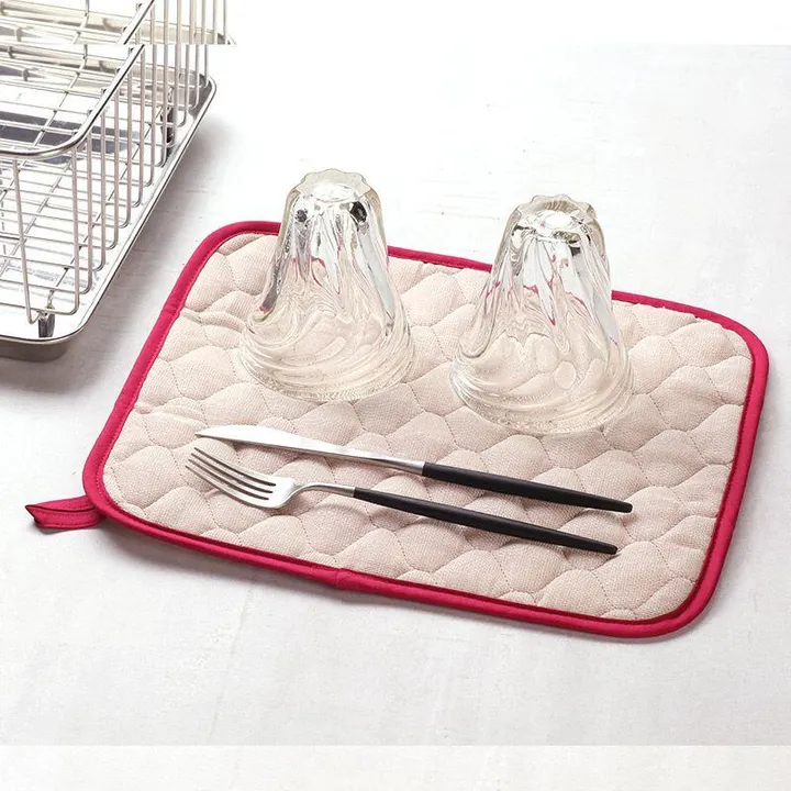 吸水性と速乾性が魅力のかや。 洗った食器やカトラリーを置く水切りマットができました。 例えばお風呂あがりに水を飲んだグラスなど 少ない量の洗い物も、 さっと洗って置いておけるので便利です。 平置きなので、食器を拭くときもスムーズ。 食器を仕舞ったあとは吊るしておけば、あっという間に乾きます。 生乾きのイヤな臭いが食器に付かず気持ちよく快適! 畳んだり丸めて収納できるので水切りカゴのように場所をとらず 省スペースでキッチンもスッキリ。 ※パイピングの太さが若干変更になります。画像と異なる場合がございます。 ≪ 蚊帳生地の特徴 ≫ ・“風は通すが、蚊は通さない”江戸時代から続く日本伝統の布。 ・目の粗い生地で非常に軽く、速乾性・通気性・吸水性に優れています。 [サイズ/組成] 32×28cm 本体:表裏は綿100% 中綿:ポリエステル100% パイピング:綿100% 日本製