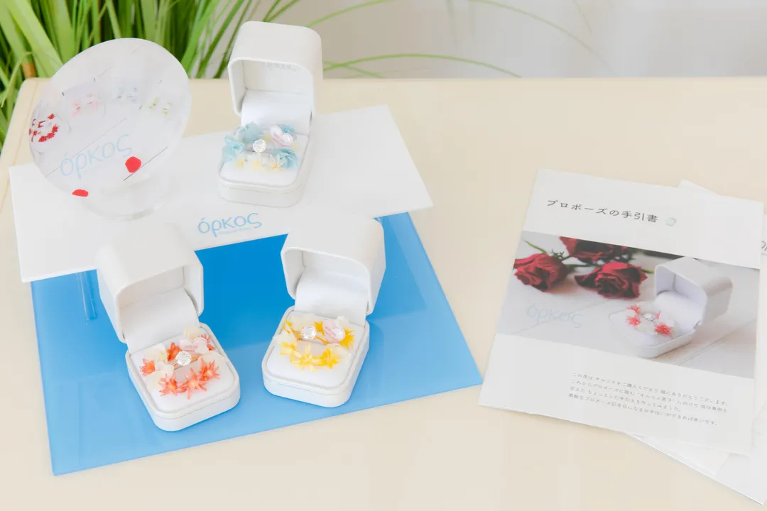 オルコスのスターターサンプルセットになります。 内容は画像の各リングケース(ケース選べます)×3or5・リング×3or5(カラー・サイズ選べます)・プロポーズ手引き&レターセット×3or5・店舗用ディスプレイ・取り扱い店登録料。 ※1店舗様初回お取引のみの購入となります。 ※それ以降のお取引は1個からご注文できます。(掛け率は別途ご連絡いたします。) ※商品画像等もご連絡いただければ、別途ご提供いたします。 ※ECでの販売はご遠慮いただきます。 『想いと願いを誓いに!』 ギリシャ語で『誓い』を意味する『オルコス』は、彼女を想いながら選ぶフラワーヘッドリース&プロポーズリング。 あなたの届けたい想いをフラワーヘッドリースに、叶えたい願いをプロポーズリングに込めた『オルコス』は、ふたりの思い出にのこる感動的な箱パカプロポーズをサポートします。 オルコスにはプロポーズの手引と越前和紙のレターセットが同封されています。 手紙を書くことは、ふたりのこれまでを振り返り、彼女への想いを改めて強く深くできる時間でもあり、プロポーズの言葉をじっくり考えれます。 本番では手紙を読み上げるのもよいし、別れ際にプチサプライズで渡す演出もできます。 そして、オルコスと一緒に大切なプロポーズの思い出として、飾ることも出来ます。