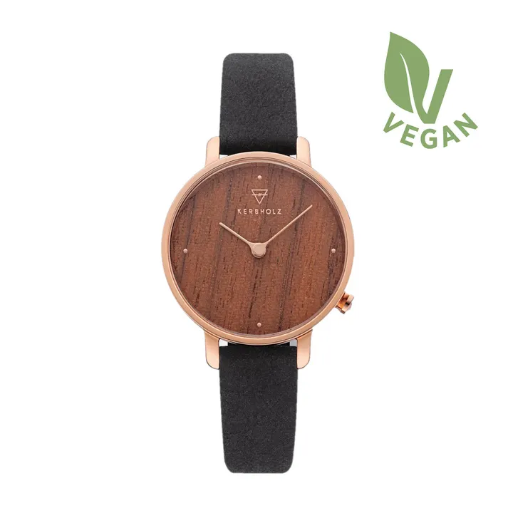 ケース部分に木材を採用したレディースコレクション「EMMA」。ストラップには環境に配慮したヴィーガンレザーを使用しています。小振りな30mm径のフェイスに時分針のみを配置したミニマルなデザインが上品な雰囲気を演出します。