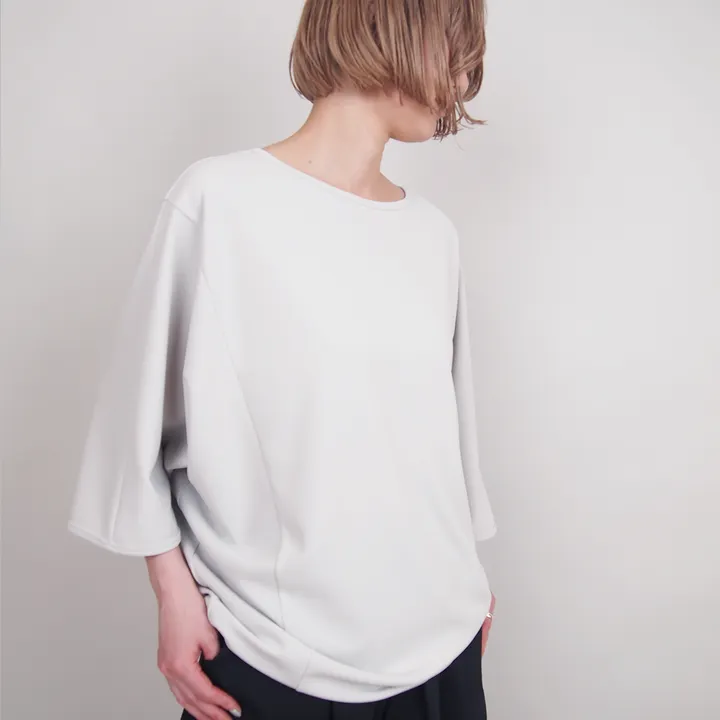 さらっとした着心地と、ボディラインをさりげなくカバーするデザインで、シンプルなコーディネートも様になるボートネックドルマンスリーブTシャツ。 従来のダンボールニットでは両立しえなかった軽さと膨らみが融合した生地です。 ストレッチ性にも優れながら適度なハリ感があるため、着心地も抜群です。 定番アイテムであるボートネックドルマンスリーブをTシャツにしました。 柔らかい生地とドルマンのフォルムが身体に優しく馴染むため、気になるボディラインを隠しながら美しく魅せてくれます。 七分丈が気になる腕のラインを隠しつつ、手首を見せることですっきりとした印象に。 ※お色違いも生産可能です。ご希望の際はご相談ください。
