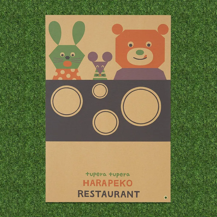 PICNIC RUG はらぺこレストラン tupera tupera(ツペラツペラ)デザイン crepの「はらぺこレストラン」は、再生紙でできた遊べるレジャーシートです。 軽量で、折りたたむとコンパクトになるので遠足やピクニック、お花見、運動会などはもちろん、 ご家族やご友人とのキャンプ、ベランピング、公園、おしゃピク、BBQ(バーベキュー)など、あらゆるお出かけシーンでおすすめです。 裏面はポリエチレンラミネート加工を施しているので濡れた地面でも気兼ねなく使用できます。 お皿にドングリや松ぼっくりなどをおいて、はらぺこな動物たちに食事を振る舞う。そんなシェフになれるラグです。 お子様の外遊び、おままごとはもちろんのこと、雨の日のおうちピクニックなどにもおすすめです。お孫さんへのギフトにも最適! 1~3人用のレジャーシートです。 遠足やピクニックなど、1~2人で座ってお弁当を広げたり、荷物を一緒に置くスペースが確保できるサイズ感です。 【tupera tupera(ツペラツペラ)】 亀山達矢さんと中川敦子さんによるユニット、tupera tupera(ツペラツペラ)とのコラボレーションラグです。 「ラグで遊ぼう!ラグを楽しもう!」というコンセプトから生まれました。 ツペラツペラさんは、絵本やイラストレーションをはじめ、工作、ワークショップ、アートディレクションなど様々な分野で幅広く活躍されています。絵本に、「しろくまのパンツ」「パンダ銭湯」「かおノート」「やさいさん」「いろいろバス」「うんこしりとり」など、著作多数。海外でも様々な国で翻訳されています。