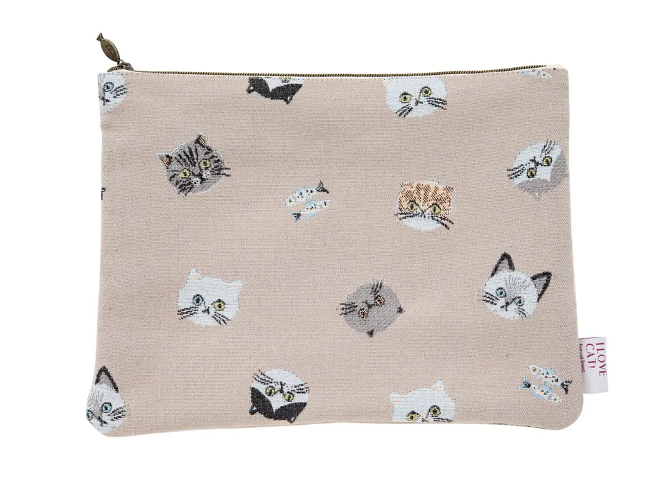 「ネコ好きさん、しゅうごーう!」 ネコ好きさんへ贈る、ネコまみれのシリーズが登場! ネコを愛してやまない方に、おすすめしない訳にはいきません。ネコ愛溢れるアイテムたちです。 『hungry...』と書かれたお魚の引き手チャームがワンポイントになったマルチポーチ。 フラットな形状を生かして、iPadやノートパソコンの持ち運び用に◎ 内ポケットには充電ケーブルやタッチペンなどのアクセサリー類を入れることができます。 B5サイズ程の書籍も入りますので、仕事にも学校にも大活躍します。 他のアイテムとセットにしてネコ好きさんへの贈り物にいかがですか?