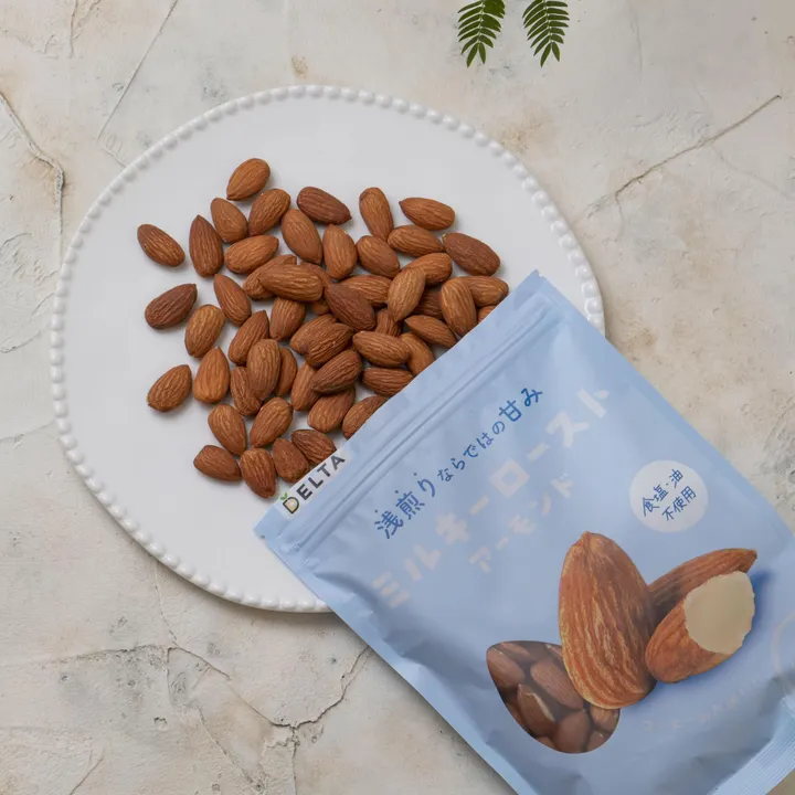 ”アーモンドってこんなに甘かったんだ” 素焼きでも生でもない。噛むほど広がるミルキーな甘み——アーモンドの新常識! 表面はカリッと香ばしく、噛んでいくとアーモンドの本来の甘みが楽しめる絶妙な浅煎り加減の”ミルキーロースト”のアーモンドです。 外は軽やかに香ばしく、中は生アーモンドのようなやさしい甘み。深煎りにはない自然な味わいとコクが特徴です。 ほどよい焙煎がもたらす甘香ばしさと旨味のバランスで、ひと粒、またひと粒とついつい手が伸びてしまう味わい。コーヒーとのペアリングにも最適です。 食塩・油不使用で、アーモンドのもつ栄養(ビタミンE・たんぱく質・食物繊維など)をそのまま楽しめます。浅煎りだから風味が長持ちし、美容や健康を意識する方にもぴったりなシンプルなおいしさです。