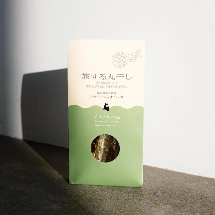 老舗の干物屋がたくさん残っている全国でも珍しい町、鹿児島県阿久根市。 この港町で漁師たちが朝方4時から6時に獲ってくる「ウルメイワシ」は、おなかの中にエサが残っていないので苦みが少なく、食べやすい干物になります。 お酒のアテのイメージが強い丸干しですが、時代の流れと共にライフスタイルも変わり、今では食卓で丸干しを見ることは随分なくなりました。 それでも「丸干しの良さを守りたい」と、朝どれの美味しい丸干しを世界の国々の味をイメージしたオイルに漬けました。 南イタリア、プロヴァンス、マドラス、阿久根…まるで日本の丸干しが世界をわたり歩いているような風味が丸干しの旨味と共に口の中に広がります。 創業昭和14年の下園薩男商店が提案する干物の新しい形です。 製造は手作業。じっくりと干され旨みが凝縮した丸干しは、より食べやすく頭としっぽを切り、一尾一尾製造スタッフが丁寧に瓶の中に詰めていきます。少しでも力の加減を間違えるとほろりと崩れてしまう丸干しを傷つけることなく、隙間なく瓶に整然と詰めていくのは一朝一夕でできることではありません。美味しい丸干しをより多くの人に知って食べてもらい、手に取ってくれるお客様の豊かな生活の一つに加われたら。そんな想いと共に丁寧に一尾ずつ詰めています。 ~プロヴァンス風~ タイム、セージ、フェンネルなど、プロヴァンス地方でよく使われるようなハーブをブレンドしたエルブドプロヴァンス。そのハーブとブラックオリーブをオイルに入れて煮詰めました。爽やかな香りで丸干しがすっきりとした味わいになります。 白ワインにも合うおいしさで、ニース風のサラダにぴったりです。丸干しにオリーブを添えてお召し上がりください。 時間を問わず、メインにも軽食にもおつまみにも。 風味豊かなオイルは、オイルパスタやドレッシング、ソースなどに使っても美味しく召し上がれます。 ※写真は盛り付けイメージです。丸干し以外の食材は販売物に含まれません。 ~活用レシピ~ ●丸干しのニース風サラダ 旅する丸干しのオイル小さじ2、酢小さじ1、塩ひとつまみを混ぜ、ドレッシングを作り、くし切りのゆで卵、トマト、ブラックオリーブ、ゆでたジャガイモ、レタス等のサラダに丸干しを皿に盛り、ドレッシングをかけて完成です。冷えた白ワインやロゼと一緒にどうぞ。 ●旅するカナッペ クリームチーズと丸干し、オイルをフードプロセッサーにかけ、フランスパンに塗ります。丸干しとハーブをトッピングして完成です。 ●丸干しのバーニャカウダ 旅する丸干しのオイル大さじ1とマヨネーズ大さじ1を混ぜ、アスパラガスやパプリカ等、お好みの野菜をつけてお召し上がりください。市販のバーニャカウダソースと丸干しをフードプロセッサーにかけても美味しいソースが完成します。