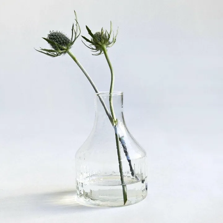 小さいながらもしっかり入ったラインがポイントのミニフラワーベース。 小ぶりなお花を飾ったり、一輪挿しとしてはもちろん、置いておくだけでもインテリアとして映えるデザイン。窓辺や食卓、洗面所などにも使いやすいサイズ感です。 【リューズガラスについて】 リューズガラスとは再利用されたガラスのことで、一般的には「リサイクルガラス」や「再生ガラス」とも呼ばれています。 一度は捨てられたり不要になったガラスをリサイクルして使っているため、環境にやさしいサスティナブル( Sustainable =持続可能)な社会への取り組みとしても注目されています。 リューズガラス製品は一つひとつが職人たちの手によるハンドメイド。 炉(ろ)で溶かしたガラスを竿(さお)ですくい取り、型の中で息を吹き込みながら作る「型吹き成形」という技法で、たとえ同じ型のシリーズであっても、全く同じ仕上がりになるということはありません。 ガラスの流れや小さな気泡、口の部分に盛り上がった箇所などがあったりしますが、これは吹き竿からガラスをカットした後、熱処理した時にガラスが流れてできるもので、これもまた吹きガラスの特徴です。 ハンドメイドならではの、ガラス表面に生まれるわずかな“しわ”や小さな気泡、繊細な表情の違いなどをお楽しみください。 ※リューズガラスは再生ガラスを使用した当社商標登録商品です。 ★合わせてオススメのアイテムはこちら ★その他リューズガラスのフラワーベースはこちら ★【新規】商品はこちら ★【人気】商品はこちら 【ナチュラル】【インテリア】【ガラス】 【12/1】【リサイクルガラス】【フラワーベース】【花瓶】【一輪挿し】【まとめ】