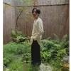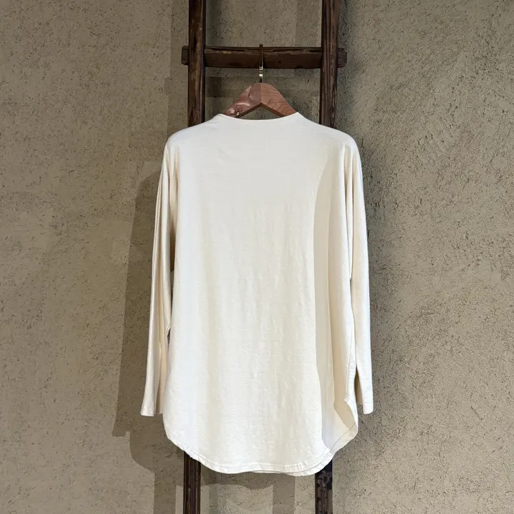 ヘンプ53%、オーガニックコットン43%、 スパンデックスのジャージ生地を用いたユニセックロングスリーブ。 ストレッチが少し入ることで、 より丈夫で伸縮率が高くしわになりにくい生地を使用。 表面もスムースな素材によりあらゆる服との相性も良い素材です。 腕周りのデザインも動きやすく、無駄のないシンプルですっきりした形状で、体型に応じて、品よく美しく着用いただけます。 男性の場合は長袖カットソーとして、 女性の場合はチュニックのようにもご使用可能。 季節を問わずインナーとして、 また1枚でも美しくすっきり着用していただけます。 ヘンプ×コットンの混紡は通気性・保温性・調温性・調湿作用に優れ、コットンのやわらかい肌ざわりのよさとヘンプの丈夫な素材感をあわせ持つ、環境と身体にやさしい素材です。 ヘンプについて詳しくはこちらから ▷(https://www.hempfabric-organic.com/hemp) COLOR:white SIZE:1 着丈 77cm 裄丈 70cm 裾幅 58 cm SIZE:2 着丈 83cm 裄丈 71,5cm 裾幅 60cm