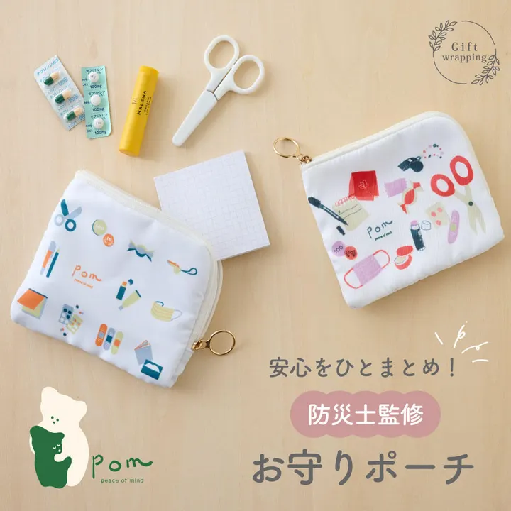 かわいいふりして、なかなかやるんです。 リップなどのコスメはもちろん、サニタリー用品なども入れることができるフラットポーチ。 おしゃれなプリントには、防災グッズとして持っておきたいアイテムが描かれています。 いつものバッグに、いつものポーチ替わりに持つだけで、いざというときに役立つ、0次の防災。 1.【防災士監修】 pom(ポム)は「がんばらない防災」をコンセプトに、 日常的につかうアイテムをこれにチェンジするだけで、万一のときに役に立つおまもり雑貨です。 商品開発の際には、3児のパパでもある防災士さんにご協力いただき、 有事の際にも役立つ機能性を備えたラインナップとなっております。 2.内側にパーソナルデータが記載できる! 万一のとき、いつもはできていることがパニックでできなくなったりするもの。 ちいさな子どもやお年寄りの方でも必要な情報を伝えられるよう、 情報を書き込めるネームタグがついています。 普段は内側に隠すことができるので、必要のないときは情報を守ります。 公衆電話のかけ方が記載されているのもポイント。 小さなバッグでもかさばらない小さめサイズ。 暖色・寒色の2色展開で、性別・年齢問わず幅広いニーズに対応できます。 父の日や母の日、敬老の日のプレゼントや入園祝い、 入学祝いなどもらって嬉しい実用ギフトです。