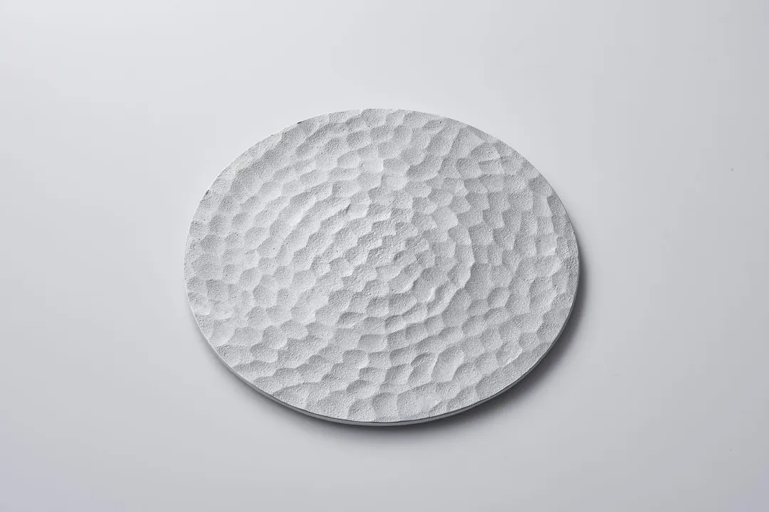 「ひんやり」をキープしてくれるアルミ鋳物のスイーツプレート アルミ合金は熱伝導性が良く、冷蔵庫で冷やして使うと効果的。 デザートやアペタイザーのおいしい温度をキープしてくれます。 ・MATERIAL:アルミ合金 ・SIZE :(L)φ200×H8 ㎜ ・WEIGHT:(L)370g ・割れにくく、壊れにくい優れた耐久性で、食品衛生法をクリアする安全な素材です。 ・銀食器を思わせる高級感のある質感です。 ・水の約2.7倍の重量感は見た目以上に軽く、女性でも気軽にお使い頂けます。 ・新聞印刷版(アルミ版)を精錬して鋳造する、サスティナブルな製造工程で作られています。 ・ロケット部品素材を供給する伝統的砂型鋳造で、職人が一つ一つ手作りでお届けします。一つ一つ違う表情、砂地の質感を大切にしています。