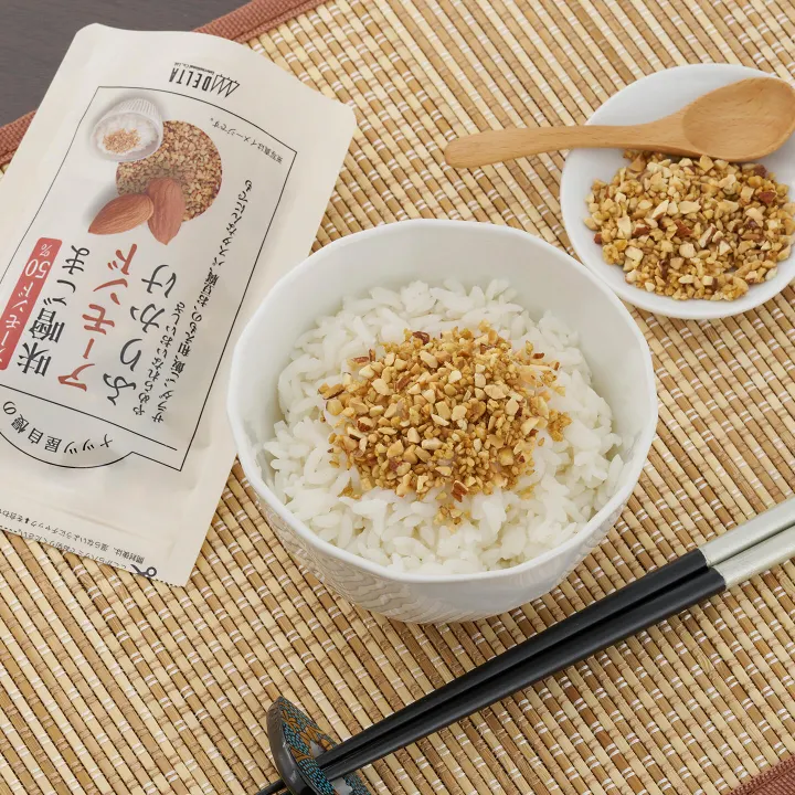皮付きクラッシュアーモンドを約50%配合した、味噌ごまとアーモンドのふりかけです。 香ばしい香りでサクサク食感がごはんによく合います。サラダや豆腐、野菜炒めのトッピングにもおすすめです。そのほか、和え物、パスタ等様々な料理のトッピングにも。