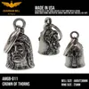 アメリカ製ガーディアンベル社製ガーディアンベルです。 MADE IN USA アメリカ製 交通安全 魔除け 御守り ガーディアンベル アメリカのライダーの間には、事故や、転倒の原因は「道路にひそむ悪魔」によるいたずらだという伝説があります。悪魔は走る者に悪戯やトラブルを運んできます。このベルは美しい音色で悪魔たちを追い払うと言われ愛されています。そんな悪魔のいたずらを防ぎ、御守りとなるのが、守護者のベルという意味を持つガーディアンベル。 日本でも鈴の音(ね)は神道では魔除けの音と言われています。ピューター製の鈴でいい音色でガーディアンベルはデザインも様々あります。 またガーディアンベルにまつわる伝説として、プレゼントとして送られたベルの効果は、自分で手に入れたものの2倍になると言われています。 それゆえに彼氏・彼女・友達・家族へのプレゼントとしての人気も非常に高まっています。 シルバーアクセサリーのようにおしゃれに装着できて素敵な音色を奏でるガーディアンベル。 バイカー以外にも自転車や旅・交通安全のお守りとしてお使いいただけます。 カバン・ランドセル・キーホルダー・ペットの首輪等に付けてお使いください!! ※タイラップ等でバイクのフレームにも簡単に取り付けできます。 アメリカンモデルだけではなく、旧車ファン、レプリカライダーまで、さらにバイクだけでなく、自転車や車にもピッタリな御守りとなっています。 アクセサリーとしても人気で、アイディア次第で車体だけでなく、キーホルダーや鞄など、どこにでも付けておしゃれに楽しめます。