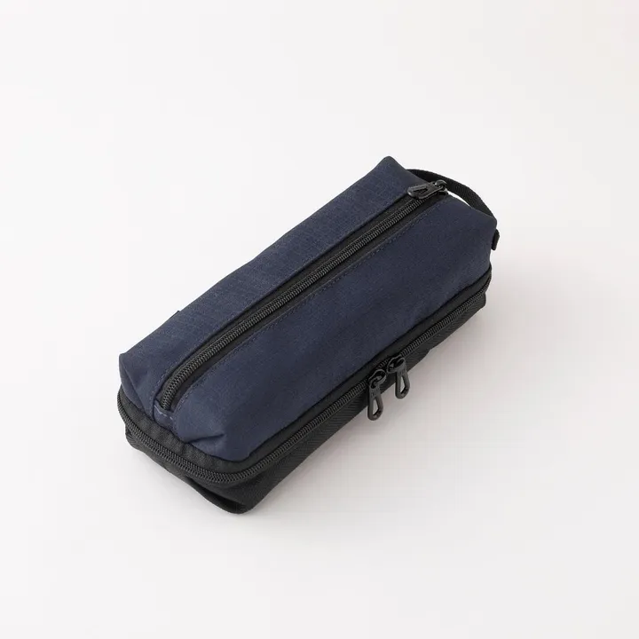 本体生地は同一色の糸で織ることによってナチュラルな表面質感に加え、ツイルを格子状に織り込んだ特殊なハイブリッド素材を採用。 大容量の二層式ペンケースです。 カッターやハサミなどかさばる物を分けて収納できます。 下部には小物用メッシュポケットがあり、すっきり整理整頓できます。 ハンドル付で持ち運びにも便利です。