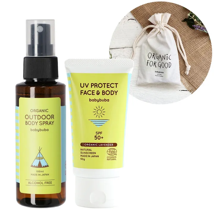 UVプロテクト フェイス&ボディとアウトドアボディスプレーのセット。 ーーーーーーーーーーーーーーーーーーーーーーーーー ◾️UVプロテクト フェイス&ボディ オーガニックUV最高指数<SPF50+/ PA+++> ノンケミカル、ノンナノ、天然由来成分100%のUVミルクが新登場! 紫外線吸収剤を使わずオーガニック最高指数のSPF50+を実現!紫外線からしっかりお肌を守ります。 さらに、表皮の薄いお肌を乾燥から守るため、ホホバオイル、インカインチオイル、バオバブオイルを配合し、お肌に潤いを与え、肌荒れを防ぎ、キメを整えます。 白浮きせず、軽いつけ心地で、伸びがよいミルクタイプ。 敏感肌の大人の化粧下地としてもおすすめ。 オーガニックラベンダー精油のやさしい香りです。 《真夏の紫外線もしっかりブロック》 UV-Aを防ぐ「酸化亜鉛」、UV-Bを防ぐ「酸化チタン」 2種類の紫外線フィルター で紫外線をしっかり弾き返します 《やさしく心地よく》 ノンケミカル、ノンナノ、天然由来成分100%使用 保湿効果のあるオーガニックの植物オイルを使ったしっかりめのミルクタイプ オーガニックラベンダーの精油の爽やかな香りでリラックス ◾️アウトドア ボディスプレー 天然由来成分100%、アルコールフリー 天然芳香成分配合の爽快な香りのボディスプレー。 ローズマリー、ユーカリ、ティーツリー、セイヨウハッカ、ラベンダー、5つの精油の香りでデリケートなお肌をガード。 外に出る機会の多い季節、お散歩や自然の多い場所へのお出かけに、精油の香りで春夏の刺激から守ります。 《POINT》 ・天然由来成分のみ使用 ・アルコール(エタノール)不使用 ・ディート不使用 ・石油系界面活性剤不使用 ・オーガニックの5つの精油をブレンド ・エコサートコスモス認証取得 《使用方法》 体に直接スプレーしてお使いください。 また、洋服、帽子、ベビーカー、など、身の回りのものにスプレーしてお使いいただくこともできます。 香りが弱まったと感じたら(※)、再度スプレーしていただくと効果的です。 ※香りの持続時間は、汗の量やその時の環境に応じて異なります。