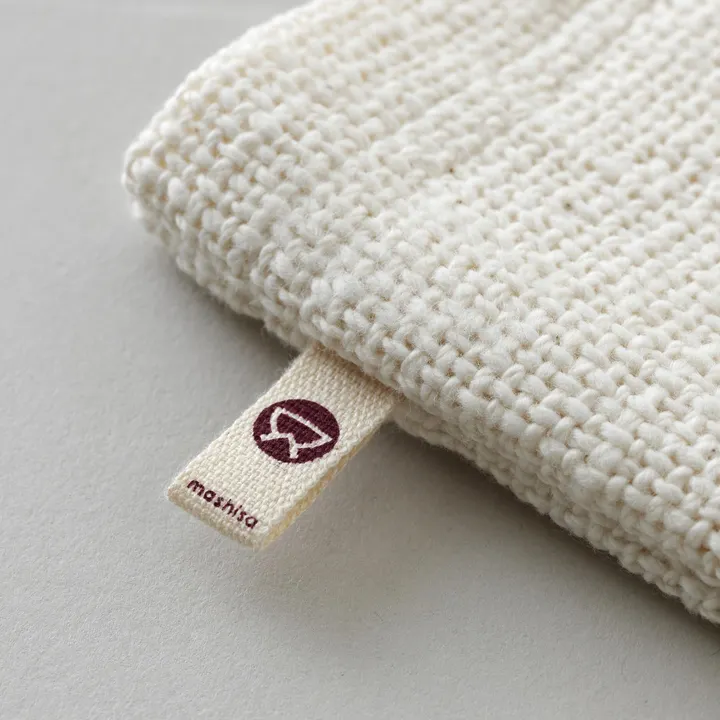和紡布を二重にして、手にはめて使うミトン型の体洗いを作りました。二重の和紡布に手ごたえがあり、先がラウンドになっているので洗いやすいです。よく濡らしてやさしくこするのがポイントです。マッサージにもお使いください。小さいお子様や、介護や看護の必要な方など、他の人を洗ってあげる時にも使いやすいタイプです。ただし、こすり過ぎにはご注意を。