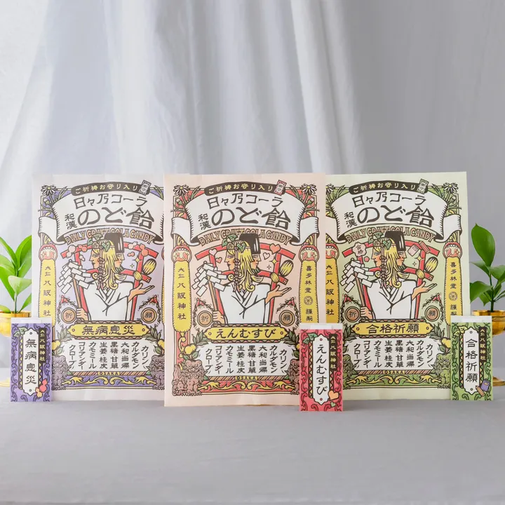 💡【由緒正しい神社でご祈祷したお守り入り】ご祈祷内容別の3種類のお守りをご用意しました 💡【贈り物に最適なパッケージ】贈り物や手土産に最適、選ぶ楽しさを感じるパッケージに 💡【10種のいたわり成分配合】黒糖、和漢ハーブ、スパイスなど喉をいたわる成分をブレンド 💡【日々乃コーラの風味を喉飴に】爽やかなコーラの風味の中にスパイスやハーブが香ります 💡【奈良県産和漢ハーブ】「くすりの町・高取町」の和漢ハーブ・大和当帰の葉を粉末にして配合 💡【老舗飴菓子専門店の気品ある甘味】明治28年創業以来守られる製法で手間暇かけて炊き上げました 【ご祈祷お守り入り♪大仁 八阪神社さんとのコラボ和漢のど飴】 2024年末に販売開始して以来人気の日々乃コーラ和漢のど飴に、「ご祈祷お守りシリーズ」が誕生しました。日々乃コーラゆかりの地であるウメキタエリアにある大仁 八阪神社さんとのコラボのど飴です。 外袋を開けると、中にはのど飴と共にご祈祷お守りが。建立から600年近い歴史を持つ神社で実際にご祈祷していただいています。薄くコンパクトなお守りなので、財布やスマホケースに入れたり、外袋と一緒に神棚に飾ったりしてお願い事を祈願してください。 レトロな薬袋からインスパイアされた懐かしさも感じるパッケージは、贈り物にもピッタリな印象的なデザインです。A5サイズの袋の中には約15粒(57g)ののど飴が。 ※3種ともにのど飴の味(クラフトコーラ味)は共通です。 【からだ想いの「日々乃コーラ」の風味をのど飴に再現】 「罪悪感なく」毎日飲みたくなる日々乃コーラに、和漢のど飴が誕生。黒糖・和漢ハーブ・スパイスなど10種の「いたわり成分」を配合しました。 レトロな薬袋からインスパイアされた懐かしさも感じるパッケージは、贈り物にもピッタリな印象的なデザインです。A5サイズの袋の中には約15粒(57g)ののど飴が。 【明治28年創業の飴菓子専門店「喜多林堂」の気品ある甘味】 グツグツと鍋で炊き上げる創業以来の製法を守り、手間暇かけて作られる飴は気品を感じる上品な風味です。上質の砂糖特有のあっさりとした甘味とパリパリとした歯あたりの良さをお楽しみください。 【誰かに贈りたくなる佇まい】 2021年の発売以来、老若男女に親しまれている日々乃コーラの味わいをのど飴にしてみました。関西に根付く「飴ちゃん」を配る文化、大切な方への贈り物にもぴったりです。 優しく喉をいたわる一粒、ご賞味ください。
