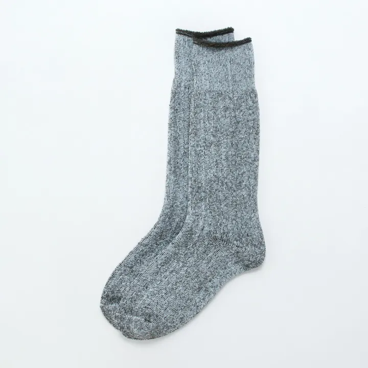 エコというものが取り組みからブームとなってしまった現代、 何が正しいのかを見失いがちになります。 地球にやさしく、お洒落を楽しむ。 足元から見直そうということで、リサイクルコットンを使用したシリーズを作りました。 廃棄される衣料や生産背景に残ってしまった糸や生地を色ごとに集めて、 もう一度ワタにし、新たな糸へ蘇らせています。 その際に一切の水を使用することなく、二酸化炭素の排出も限りなく少ない。