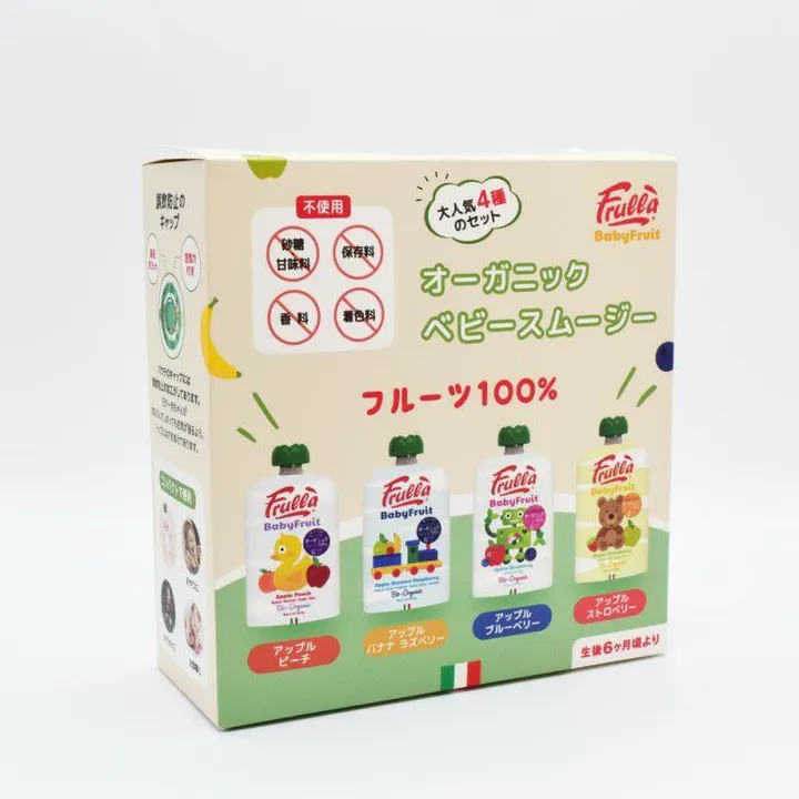 美食の国、イタリアからフルーツ100%、 赤ちゃんにやさしいオーガニックスムージーが初上陸! 外出先の離乳食として、おやつに、お子様の果物不足防止にピッタリです。 片手で口にするだけ、パッケージはそのまま捨てられるので、手を汚しません。 大人でも、サプリメントや朝ごはんの代わりにお召し上がりいただけます。 【こだわり】 ・ 水、砂糖、保存料不使用! ・ 提携農園の果物のみを使用。 ・皮や種を丁寧に取り除くので、ピュアな甘さが楽しめます。 ・保存料・着色料・砂糖不使用  グルテンフリーで消化にもやさしい! ・たっぷり100g  フルーツの栄養・水分補給に! ・持ち運び便利なパウチタイプでキャップも誤飲防止の仕様で安全!  お子様がひとりで食べることができて、忙しいママの強い味方! <フレーバーは全4種類> ・アップルピーチ 【ももに含まれる栄養素とは?】 果糖・・・体内で代謝の過程を経ずにエネルギーとなるので、赤ちゃんの体力維持に効果があります。 カリウム・・・筋肉を正常に保つ効果があります。 ナイアシン・・・皮膚や粘膜の健康維持に効きます。 ・アップルブルーベリー 【ブルーベリーに含まれる栄養素とは?】 アントシアニン・・・赤ちゃんの視力の向上、血管の保護強化になります。 食物繊維・・・体のなかの有害物質を体外へ排出する動きがあります。 ビタミンC・・・風邪予防になります。ビタミンCが白血球の動きを活発にし、体内に入ったウイルスを退治する力を高めます。 ・アップルバナナラズベリー 【バナナに含まれる栄養素とは?】 食物繊維・・・体のなかの有害物質を体外へ排出する動きがあります。 ビタミンB6・・・赤ちゃんの髪や皮膚、歯などの健康を維持します。 葉酸・・・赤血球の形成を助けます。 マグネシウム・・・骨の形成に効きます。 【ラズベリーに含まれる栄養素とは?】 食物繊維・・・体のなかの有害物質を体外へ排出する動きがあります。 ビタミンE・・・体内の脂質の酸化を防いで体を守る働きがあり、貧血の予防にもなります。 アントシアニン・・・赤ちゃんの視力の向上、血管の保護強化になります。 ・アップルストロベリー 【いちごに含まれる栄養素とは】 ビタミンC・・・風邪予防になります。ビタミンCが白血球の動きを活発にし、体内に入ったウイルスを退治する力を高めます。 アントシアニン・・・イチゴの赤い部分の栄養素にあたります。赤ちゃんの視力の向上、血管の保護強化になります。 キシリトール・・・虫歯予防になります。