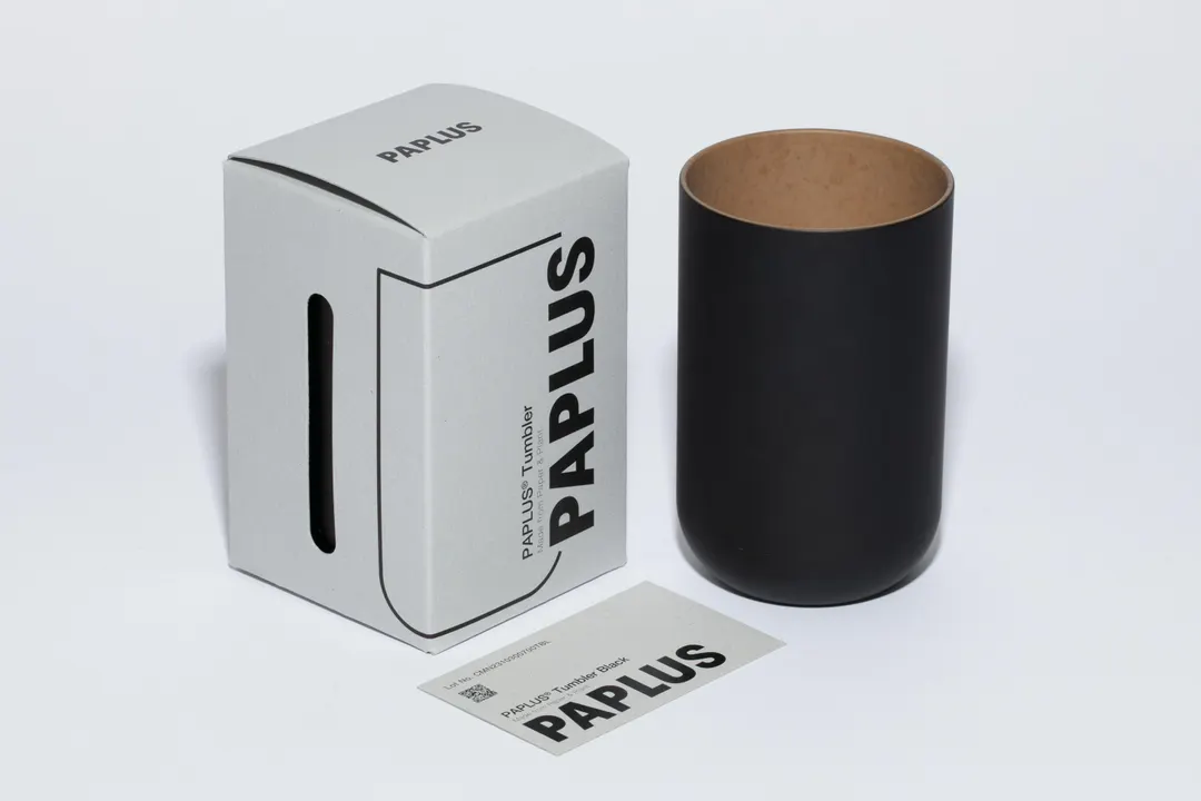 PAPLUS®(パプラス) Paplus® Tumbler Black(パプラスタンブラーブラック) Lot.No. CMN2310300700TBL ブラスト加工しない光沢のあるナチュラルな表情のPAPLUS®タンブラーの表面にマットブラック塗装を施しました。 PAPLUS®製品の原材料は、トウモロコシのデンプンを発酵して得られる乳酸が主成分のPLA(ポリ乳酸)と紙が主原料です。地球に優しい素材で作ることで、陶器や木材製品のように天然素材独特の風合いとなっており、愛着を持ってお使いいただけるよう色合い、濃淡などの個性を大切にしています。 また、使い込むうちに生じる色むらや退色は使う人の個性となって現れ、愛着の持てる一品に育つ過程をお楽しみください。 ■こだわりのデザイン PAPLUS®タンブラーブラックは、独特の素材感を生かすためシンプルなデザインにこだわりました。タンブラーのサイドのシルエットをストレートにするため特別な金型を作成し、ミニマムはシルエットに仕上げています。 ■こだわりのブラックカラー ミニマルなデザインポリシーを持つPAPLUS®にとって相性のよいブラック。表情の細部にもこだわり、マットなものを採用し、PAPLUS®本来のテクスチャーを全て消してしまわない様に内側はそのまま残し、外側だけウレタンコーティングしたツートンカラーとなります。 ■ウレタン塗装について 今回採用した塗装は、黒の顔料をウレタン樹脂に溶いて塗装するウレタン塗装となり、人体に無害とされている人工塗料で食品衛生法にも適合しています。また、天然由来成分の比率が高いPAPLUSは木材製品と同じように水に対して少しデリケートですが、ウレタン塗装をすることにより耐水性が増し、経年変化のスピードを抑える効果があります。 実はPAPLUS®の主原料であるトウモロコシ由来の生分解性樹脂(ポリ乳酸)は塗料をはじいてしまう性質を持っています。その課題を、日本のモノづくりである漆塗りのノウハウを持つ協力工場の下塗り技術により解決することができました。 *回収されたカラーバリエーションは塗装部分をグラインダーなどの工具で剥がすことができ、内側は塗装をしていないので効率よくPAPLUS®の純粋な材料だけを再製品化の工程に回すことができます。 ■パッケージへのこだわり パッケージには新聞や雑誌の古紙からできた100%再生紙である「チップボール」を使用することで天然素材であるPAPLUS®の風合いととてもマッチしています。 ■暖かい飲み物もOK 植物由来成分純度の高い製品の多くは耐熱機能を持たないものが多い中、PAPLUS®タンブラーブラックの耐熱温度は120℃ですので安心して暖かい飲み物にお使いいただけます。 ■地球と調和する素材 PAPLUS®タンブラーブラックの約86%は植物由来成分であるトウモロコシ由来の樹脂と紙でできています。その主成分に、耐熱性機能を担保するために粘度鉱物(約7%)と石油由来の添加剤(約7%)を加えています。 *1 また、素材の大部分は微生物の働きにより水と二酸化炭素に分解されます。*2 *1 最低限使用している添加剤は、厚生労働省が定める食品衛生法に準拠しておりますのでご安心ください。 エコ商材といわれるものの中には添加剤について言及されていないものが多くあります。 ご注意ください。 *2 分解に要する時間や程度は環境により大きく変わりますので100%を保証するものではありません。 ■使い捨てるのではなくリサイクル PAPLUS®製品はゴミとして捨ててしまうと焼却されてしまいます。ほとんど植物由来成分からできているのでカーボンニュートラル(実質的にCO2を増加させない)ですが、ゴミとして焼却するのではなく、資源として回収し、再製品化することにご協力ください。共に新たな循環を作り出していきませんか。 注)リサイクルは日本国内事業のみの対応となります。 PAPLUS®のリサイクルページはこちら  https://paplus.jp/recycle/ ■生産から回収・再製品化の過程を公開 PAPLUS®タンブラーブラックには「トレーサビリティカード」が同梱されています。そのカードにはロットナンバーとQRコードが記されており、そこからその製品の製造時期、タイプ、回収・再製品化された数量などサイト上で確認いただけます。 PAPLUS®タンブラーブラックのトレーサビリティページはこちら https://paplus.jp/traceability/cmn2310300700tbl/