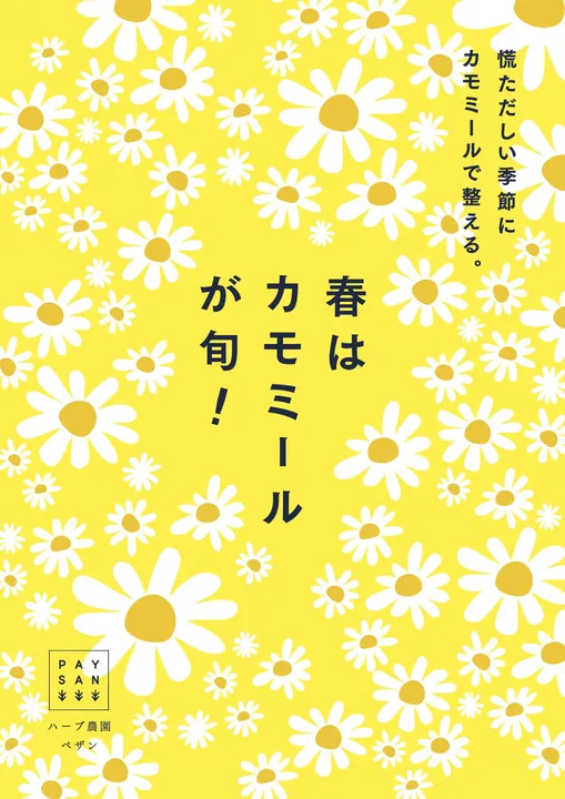 「春はカモミールが旬」のPOPです。 季節に合わせてのおすすめハーブのPOPです。 ラミネート済みでのご用意です。 お客様へのご案内などにご活用ください。 ※データで欲しいという方は個別にお問い合わせください。