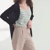 ・全体に縦のリブ編みを使用し、着用時にスリムに見える視覚効果あり ・ストレートなシルエットでヒップを軽くカバーする丈感(55サイズ基準:着丈約62cm) ・やや深めのVネックで首元をすっきりと長く見せる効果 ・ベーシックなカラーバリエーションで誰でも簡単にコーディネート可能 ・九分袖で手首が少し見え、暑苦しさなく夏まで着用可能 ・裾と袖口に1×1リブ仕上げで長く着ても伸びにくく、形状を保ちやすい仕様