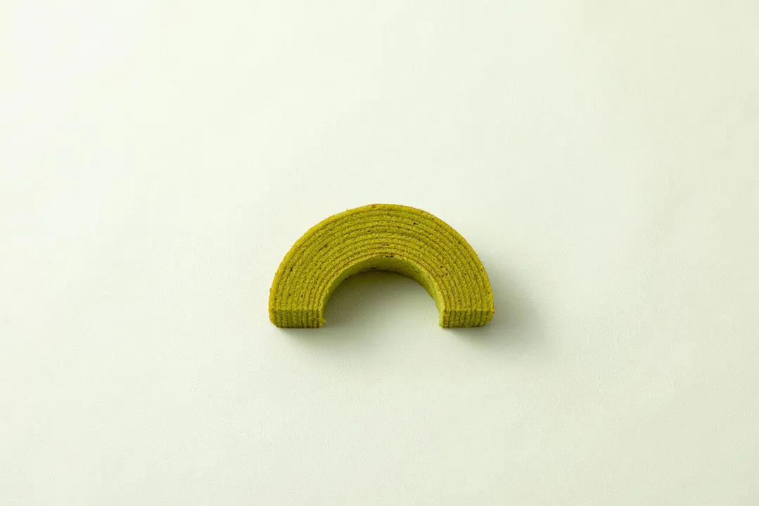 「淡路島の自然恵まれた大地から生まれた、上質な鶏卵、濃厚な牛乳、そして香り高い米粉が織り成す至福のバウムクーヘン。 しっとりふんわり食感 まっちゃフレーバーのバウムクーヘン。
