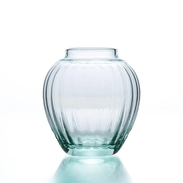 フランス語で名づけたポム(リンゴ)という名前の通り、コロンとした木の実のような形が愛らしいフラワーベース。 小ぶりサイズで、カウンターや窓辺にそっと彩りを添えてくれます。 【リューズガラスについて】 リューズガラスとは再利用されたガラスのことで、一般的には「リサイクルガラス」や「再生ガラス」とも呼ばれています。 一度は捨てられたり不要になったガラスをリサイクルして使っているため、環境にやさしいサスティナブル( Sustainable =持続可能)な社会への取り組みとしても注目されています。 リューズガラス製品は一つひとつが職人たちの手によるハンドメイド。 炉(ろ)で溶かしたガラスを竿(さお)ですくい取り、型の中で息を吹き込みながら作る「型吹き成形」という技法で、たとえ同じ型のシリーズであっても、全く同じ仕上がりになるということはありません。 ガラスの流れや小さな気泡、口の部分に盛り上がった箇所などがあったりしますが、これは吹き竿からガラスをカットした後、熱処理した時にガラスが流れてできるもので、これもまた吹きガラスの特徴です。 ハンドメイドならではの、ガラス表面に生まれるわずかな“しわ”や小さな気泡、繊細な表情の違いなどをお楽しみください。 ※リューズガラスは再生ガラスを使用した当社商標登録商品です。