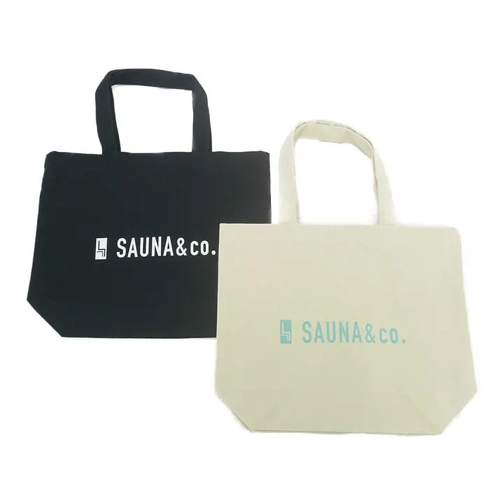 SAUNA&co.のロゴ入りトートバッグ L 【サイズ】縦32cm×横33cm×マチ10cm 【生産地】中国製 【素材・成分】綿100% キャンバス 【内容量】約10L 【生産地】中国製 S 【サイズ】縦25cm×横22cm×マチ10cm 【素材・成分】 綿100% キャンバス 【生産地】中国製 【内容量】約5L サイズはS・Lの2サイズ展開となっており、カラーはブラックとナチュラルの2カラーです。 耐久性に優れたトートバッグ 素材は綿100%のキャンバス素材を使用しており、耐久性に優れている、すなわち丈夫さが何よりの魅力です。 糸を撚り合わせているため、糸そのものに厚さが増し、張りを持ちます。 丈夫で摩擦に強い素材を使用する事で、長く愛用して頂けるアイテムとなっております。 また綿100%ということで肌ざわりも良く、長時間の外出でもストレス無く持ち運んで頂けます。 内容量は【Sサイズ5リットル・Lサイズ10リットル】 Sサイズのバッグでも2リットルのペットボトルが2本入り、帰り道のスーパーで重い買い物をした場合にも対応できる耐久性が安心のトートバッグです。