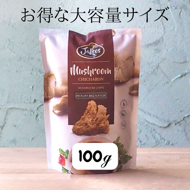 【きのこスナック】【ヴィーガン対応】 ジャリース マッシュルームチチャロン ヒッコリーバーベキューフレーバー 100ℊパック 保存に便利なチャック付きです。 スモーキーな香りとバーベキューソースの甘辛い味付けが食欲を刺激します。ビールやハイボールとの相性も最高です。