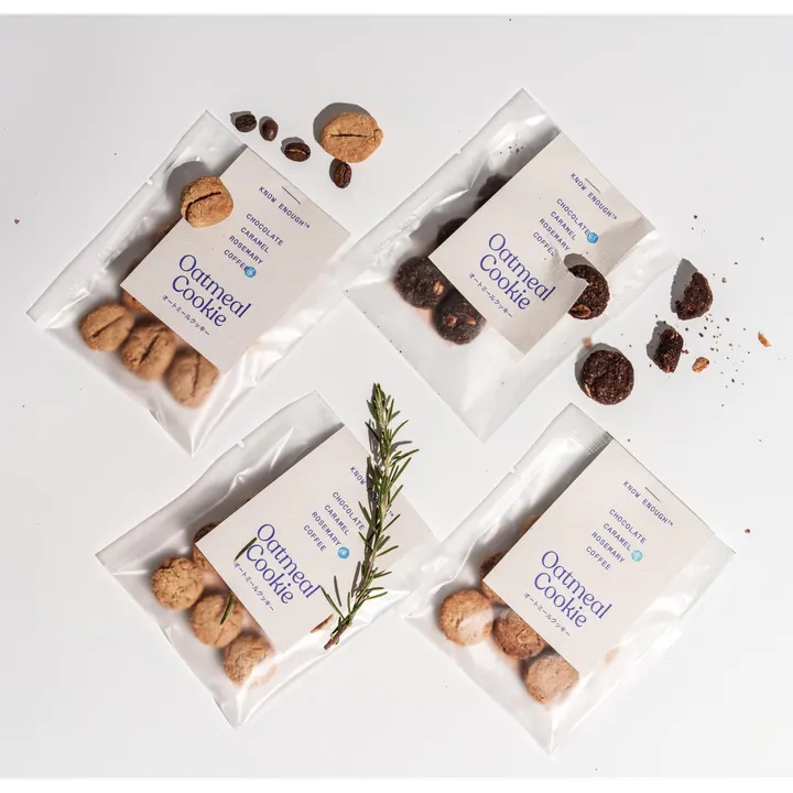 【特 長】 軽い食感でサクッと食感のクッキーです。 米粉は北海道産ゆめぴりか80%減農薬で栽培されたものです。 Vegan, Gluten-Free 【フレーバー】 ローズマリー:ハーブの妖精が奏でる、ローズマリーの魔法の甘さ。 チョコレート:ビターな興奮、一口で広がる大人の贅沢。 キャラメル:黄金のひととき、キャラメルで贈る甘美な思い出。 コーヒー:静かに広がる、焙煎の香りと深い安らぎ。 【シーン】 On The Go Brakfast 「日常のささやかな場面に、安心できる選択肢を」 朝食や外出時に、オートミールのヴィーガンクッキーは忙しい日常においても手軽に取り入れられるエネルギー補給に最適です。 朝の始まりに:コーヒーや豆乳ラテと一緒に、簡単で満ち足りた朝食に。 おやつタイムに:仕事や勉強の合間に、噛むほどに心落ち着くひと休み。 おでかけのお供に:自然散策やドライブに持ち歩いて、安心のエネルギーチャージ。 子どもと一緒に:やさしい甘さで安心して分け合える。 【 オートミールクッキーの良さ】 食物繊維が豊富:腸を整え、ゆるやかなエネルギー補給に。 腹持ちがいい:小腹を満たしてくれるので、無駄な間食を減らせる。 ナチュラルな甘み:精製度の低い素材と合わせることで、やさしい甘さ。 プラントベース&グルテンフリー:アレルギーやライフスタイルに寄り添う安心感。