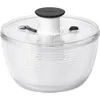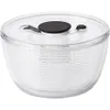 OXOの人気No1サラダスピナーの小サイズ。 1人暮らし〜2、3人にピッタリ。 片手でノブを押すだけでカゴが回転して簡単に野菜の水切りができる構造はそのままに、大きめで押しやすく、さらに効きが良くなった特許取得のブレーキボタンや、ノブを収納したままノブを持ってフタを開閉できる形で、より快適に水切りができます。 濡れた手でも滑らず使いやすいノブは、よりフラットで手になじみやすくなりました。底面には滑り止めがついていて、回転中もしっかり安定してストレスがありません。 ノブを下げて固定すればフラットになるフタは、場所を取らずに収納でき、上に物を載せることもできます。 上から中身を確認できるクリアなフタは、内側のフタが簡単に取り外せてお手入れ可能。 洗練されたデザインで、水切りした野菜をボウルに入れてそのまま食卓へサービングしたり、フタをしてそのまま冷蔵庫で保存もできて便利です。 他に大サイズもありますので、野菜の量に応じて使い分けていただけます。 漂白剤はご使用いただけません(ボウル、バスケットは可)。食器洗い乾燥機(低温設定)がご使用いただけます。