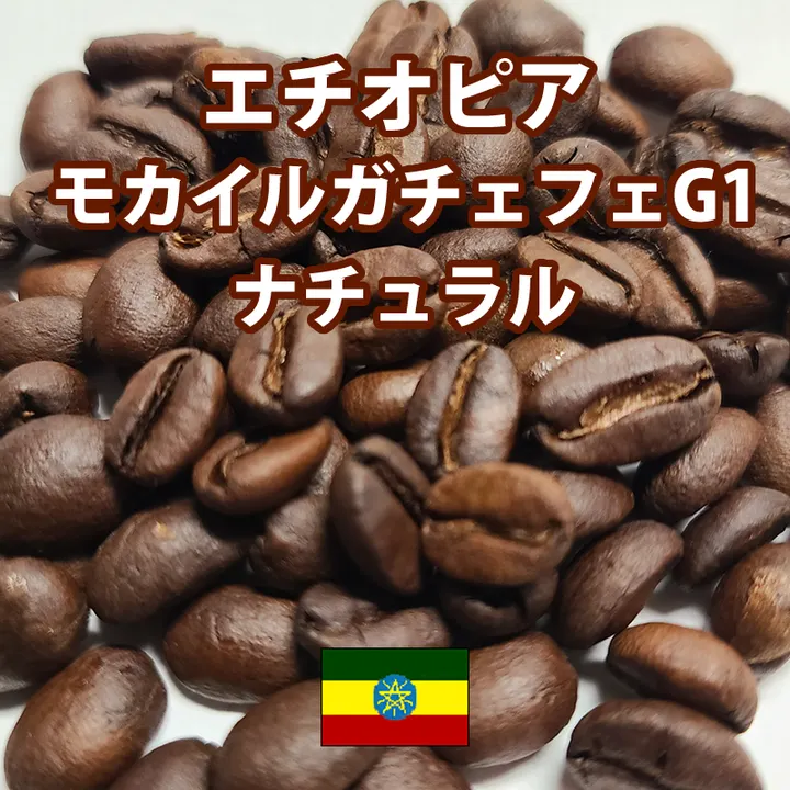 【モカ イルガチェフェG1 ナチュラル】 コーヒー発祥の地エチオピアの代表的な銘柄のひとつです。 現在紅海の紛争などで入手困難になりつつあるようです。現在の銘柄は「チェルベサ」のナチュラル精製で、最上級のG1グレードになります。 モカ好きにはたまらない、G1のナチュラル精製ならではの強いモカフレーバーと上品な酸味が特徴的。 浅煎りでは、爽やかな明るい酸味のあと甘みが感じられ、中煎りではまろやかな酸味にコクのある芳醇な香りが楽しめます。深煎りにはあまり向きません。 当店での基本焙煎は、程よいまろやか酸味とほんのり甘み・コクを感じ、飲みやすいハイローストの少し手前(中浅煎り)での焙煎になります。おすすめは断然ストレートですが、ブレンドに少量加えると、柔らかな酸味とほのかなモカフレーバーが楽しめます。 モカ特有の香りとバランスのとれた酸味をご賞味ください。 ※ミディアム、シティ等、他の焙煎度合をご希望の場合はご注文時にお申し出ください。 ※基本的には挽かずに豆のままお送りします。是非ご自宅で挽いて挽きたての豆の香りからお楽しみ下さい。 ※商品画像はハイローストですが、写真の色味は端末の設定や使用環境等で異なる場合もありますので予めご了承下さい。 苦味 ★★☆☆☆ 酸味 ★★★★☆ コク ★★★★☆ 甘味 ★★★★☆ 香り ★★★★★ ●生豆時125g→ハンドピック→焙煎→簡易ハンドピック の行程後発送いたしますので、発送時は約100gになります。 (焙煎度合により多少前後します) ●ご注文順に焙煎~発送しますので状況により多少お時間を頂く場合もあります。 ●配送はクリックポスト(日本郵便)で全国一律250円(合計数量400gごとに加算)です。  配送日および時間指定不可(ポスト投函)となります。ご了承ください。