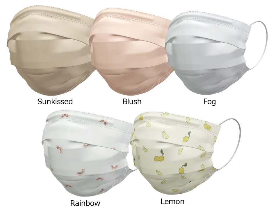 小さめサイズ&キッズサイズの方へ 5色をスペシャルセレクトしたマスクセット 全て個包装ですので持ち運びにも便利で、衛生的なマスクです サイズは横幅14.5cm 幼稚園・小学生のお子さんや小顔の女性にちょうど良いサイズをご用意いたしました 【小さめ&キッズセレクトカラー 各1枚合計5枚入】 ■Fog 薄く霧がかった朝をイメージしてお作りしたカラー 透明感の高いペールグレーのマスクは ジェンダーレスにつけていただける仕様となっております ■Blush 頬が少しピンクに染まる そんな時をイメージして作ったお色です イエロー寄りのピンクは優しくつける人を選びません ファッションの邪魔をしないお色です ■Sunkissed 太陽に愛された日焼け後の褐色肌をイメージして作ったお色です 王道のくすみベージュは日焼けした方にも色白な方にも合わせやすいマスクカラー ■Rainbow BOHO CHICなレインボーもオリジナルデザインでお作りしました 立体マスクを開くと全体にレインボーが均等に広がりシンプルながらも キッズの方にもおすすめなデザインができました ■Lemon シンプルでさりげない小さめレモン柄のマスクです レモン柄もオリジナルでお作りしました レモンとレモンの切り口をランダムに散りばめてオシャレに見える ようこだわりました 子供だけでなく小顔の女性にもおすすめです