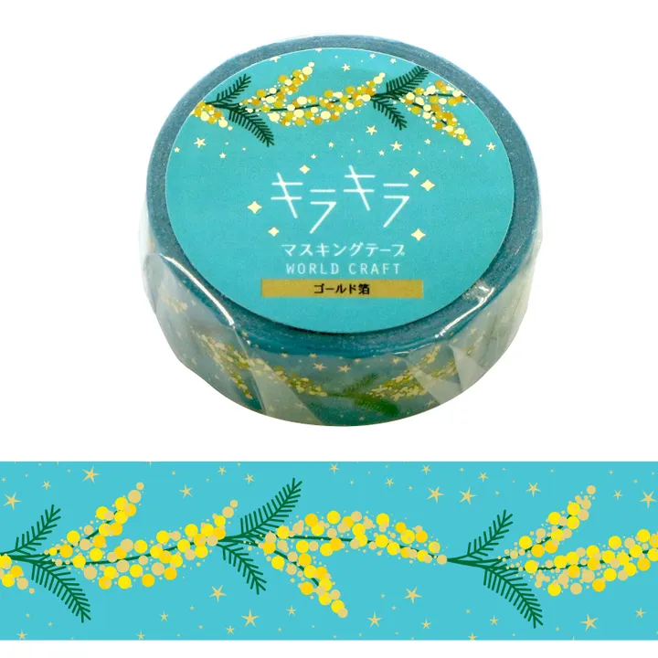 【 キラキラマスキングテープ 15mm Mimosa】  ★★ 箔を使用した、キラキラが可愛いキラキラマスキングテープ 〜 第3弾  Sky、Room、Textile の3つをテーマに <12柄> を揃えました ★★ オーガニックな雰囲気が漂う、おしゃれなミモザの人気柄! 丸くつぶつぶとした形がかわいらしく、映える鮮やかな黄色が特徴のミモザ。 ターコイズを基調とした背景色がよりミモザの黄色とゴールドの箔を引き立たせておしゃれにデコレーションいただけます♪