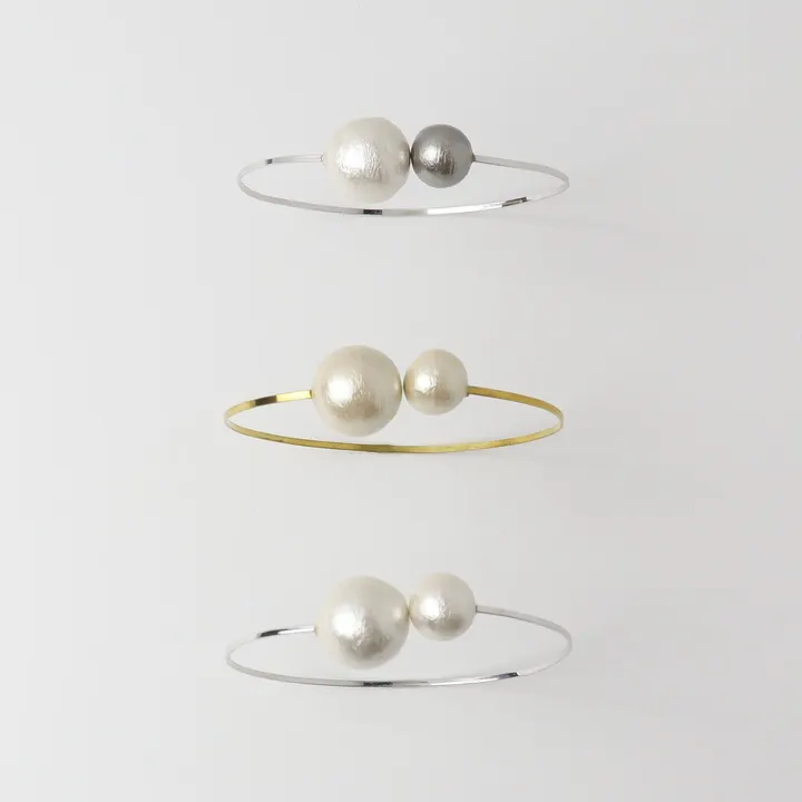 パールとパールの間が開き、着脱しやすいバングル。 無駄をそぎ落としたミニマルなデザインと、コットンパールならではの軽さも魅力的です。 温かみのあるキスカ、すっきりとしたホワイト、バイカラーがアクセントのホワイトグレーの3色展開。 イギリスの歴史ある美術館の一つ「ビクトリア&アルバート ミュージアム」 世界中のデザイナーのコレクションが集まるミュージアムショップで、日本人で初のブランドとして取り扱われている「アンク」のコットンパールコレクション。 「アンク」の感性が光る、モードな印象のコットンパールをお楽しみいただけます。 ※モニターの明るさなどによって実際の色と差が出る事があります。 日本発のブランド ― anq. / アンク ― 様々な分野を学んできたクリエイターたちで構成されたデザインチーム。「可能性を秘めたもの」をコンセプトに女性の好奇心、探求心、遊び心をくすぐるようなジュエリーを提案しています。メイドインジャパンにこだわったジュエリーを、銀座のアトリエで一つ一つ制作しています。