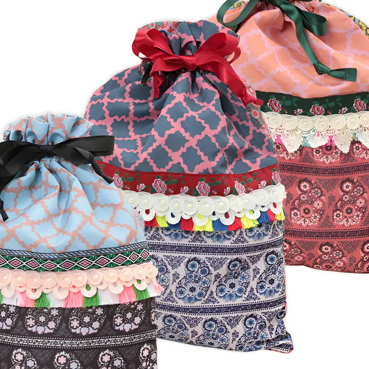 モロッカン柄のプリント生地をベースに、複数の柄生地とフリンジやレースをあしらった民族調で鮮やかなシリーズ。 もちろん旅行グッズとしての機能性も兼ね備えております。 ルームシューズを入れたり、散らばりがちな小物をまとめたりと様々な用途で使える巾着は旅先で重宝すること間違いなしのアイテムです。