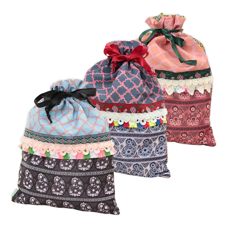 モロッカン柄のプリント生地をベースに、複数の柄生地とフリンジやレースをあしらった民族調で鮮やかなシリーズ。 もちろん旅行グッズとしての機能性も兼ね備えております。 ルームシューズを入れたり、散らばりがちな小物をまとめたりと様々な用途で使える巾着は旅先で重宝すること間違いなしのアイテムです。