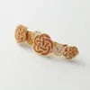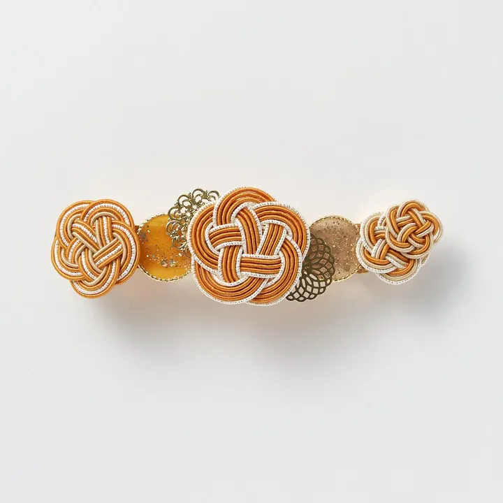 ゴールドの台座に大小4つの梅結び水引がついた華やかなバレッタ。一番人気の商品です。 一番大きな梅結びには水引きを5本使用し、組み合わせや重ねる順番を少しずつ変えているのでひとつずつ表情が異なっているのがポイントです。 海外の方にはピンク、ブルー、ネイビーなどはっきりしたカラーが人気です。 日本の方は、結婚式や学校行事用に購入される方が多くフォーマルなシーンにもおすすめです。