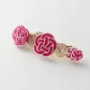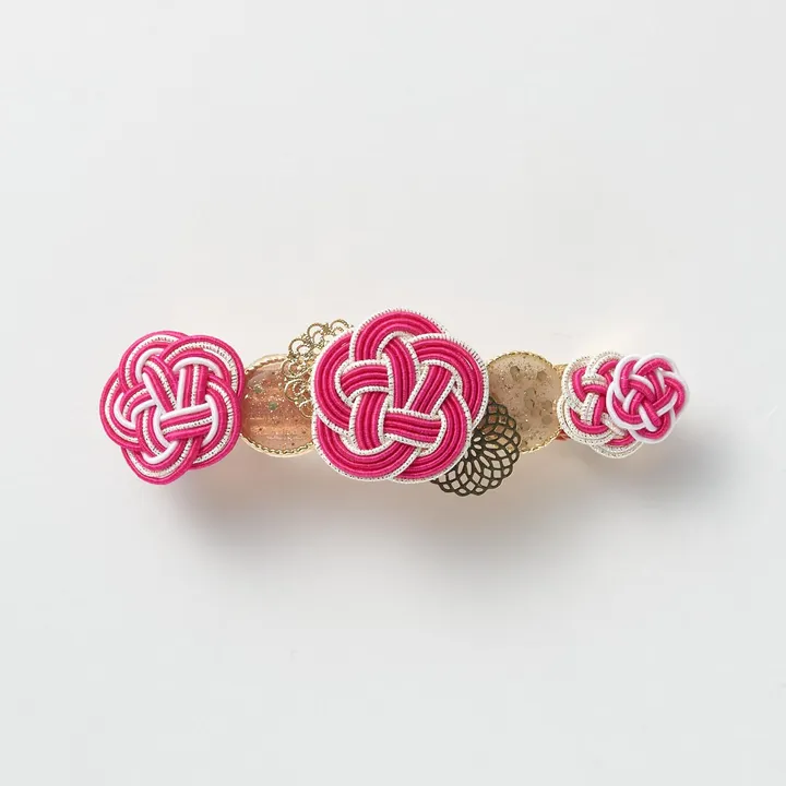 ゴールドの台座に大小4つの梅結び水引がついた華やかなバレッタ。一番人気の商品です。 一番大きな梅結びには水引きを5本使用し、組み合わせや重ねる順番を少しずつ変えているのでひとつずつ表情が異なっているのがポイントです。 海外の方にはピンク、ブルー、ネイビーなどはっきりしたカラーが人気です。 日本の方は、結婚式や学校行事用に購入される方が多くフォーマルなシーンにもおすすめです。