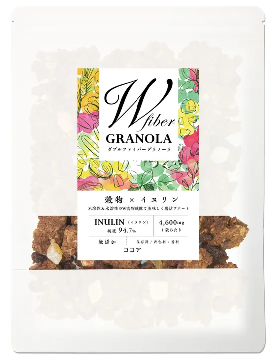 1) この商品で何ができるのか/どんな商品なのか(製品概要) 区分:シリアル加工食品(グラノーラ) コンセプト: 国産生おから(不溶性食物繊維・たんぱく)+オートミール(β-グルカン)に、高純度イヌリン(水溶性/原料純度目安94.7%)を配合したW食物繊維設計。 メープル風味、無添加設計(保存料・着色料・香料不使用)。 2)どうしてこの商品が誕生したのか(開発背景) 朝食や間食で食物繊維摂取(不溶性+水溶性)を一度に行いたいという需要に対応。 国産生おから×オートミールで食感と栄養バランスを両立し、高純度イヌリンで水溶性繊維を強化。 3) 使うシーンの明示/導入メリット 想定販路:ドラッグストア、自然食品店、GMS、EC、カフェ物販 など 棚割提案:糖質配慮/グルテンフリー/食物繊維強化/プラントベース 導入メリット: W食物繊維・**原料訴求(国産おから/OTCOオーツ/高純度イヌリン)**で比較軸が明確 無添加(保存・着色・香料不使用)、ココナッツオイル使用など安心感の高い処方 ナッツ&フルーツで食味・見栄えが良く、リピート提案が容易 4) お勧めの使い方 1食の目安:40–50g(牛乳、豆乳、ヨーグルト、植物性ミルク等と一緒に) 活用例:朝食の主食置換/間食の置き換え/サラダのトッピング/アイス・パフェのクラッシュ利用 注意例:食物繊維豊富なため、初期は少量から。体質・体調によりお腹がゆるくなる場合は量を調整。 5) どんな人におすすめか 食物繊維の摂取を強化したい層 グルテンフリーや無添加志向の層 朝食の栄養バランスや間食の質を高めたい層 ※個人差があり、医薬的効能の断定は不可。