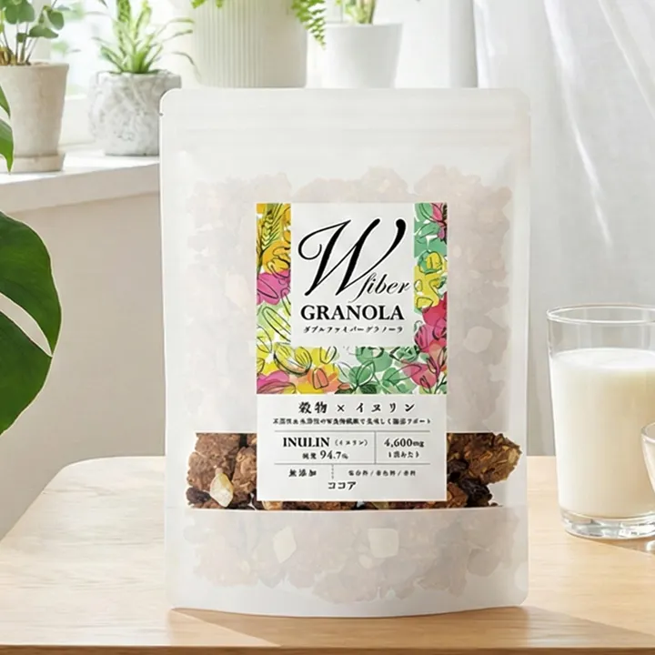 1) この商品で何ができるのか/どんな商品なのか(製品概要) 区分:シリアル加工食品(グラノーラ) コンセプト: 国産生おから(不溶性食物繊維・たんぱく)+オートミール(β-グルカン)に、高純度イヌリン(水溶性/原料純度目安94.7%)を配合したW食物繊維設計。 メープル風味、無添加設計(保存料・着色料・香料不使用)。 ✅【W(ダブル)の食物繊維で、理想のモーニングルーティン。最高品質イヌリンを贅沢に練り込んだ「罪悪感ゼロ」のグラノーラ】 モンドセレクション5年連続最高金賞受賞の「高純度イヌリン」を、国産生おからと有機オートミールの生地にたっぷりと練り込みました。 「スッキリした毎日を送りたい」「でも美味しい朝食は諦めたくない」。 そんな願いを叶えるために、素材の質と配合バランスを極限まで追求した、美容と健康のためのプレミアムグラノーラです。 ✅【不溶性×水溶性のシナジー。内側から「出す・整える」を一度に】 水を吸って大きく膨らみ、内側をお掃除する「不溶性食物繊維(おから・オートミール)」と、善玉菌のエサとなり内側の環境を整える「水溶性食物繊維(イヌリン)」。この2つの食物繊維が互いの働きをサポートし、重苦しい毎日からの解放を助けます。特にイヌリンは、善玉菌のエサになる効率が100%と言われる最高スペックの食物繊維です。 ✅【厳選された「日本一」の素材たち。妥協のない原材料選び】 ● 国産生おから:全国豆腐フェスティバル1位に輝いた「上杉食品」の生おからを使用。 ● 有機オートミール:OTCO認定を受けた農薬・化学肥料不使用の高品質な素材。 ● こだわり素材:甜菜糖、バニラビーンズ、ヒマラヤ岩塩、ココナッツオイルを使用。 さらに6種のドライフルーツとナッツをどっさり配合し、ひと口ごとに変わる豊かな味わいと食感を楽しめます。 ✅【日本マタニティフード協会認定。グルテンフリー&無添加の徹底した安心感】 本品は「一般社団法人日本マタニティフード協会」の認定商品です。 保存料・着色料・香料は一切不使用。さらにグルテンフリー、ヴィーガン対応、糖質40%カット(※)を実現しました。トランス脂肪酸の懸念がある油も使用していないため、妊産婦さんはもちろん、お子様からご高齢の方まで、ご家族全員の健康的な朝の習慣として安心してお召し上がりいただけます。 (※一般的なグラノーラと比較) ✅【現役医師も推奨。忙しい朝に「賢く補う」新習慣】 予防医学・美容医療の山下真理子医師が推奨。 「Wファイバーグラノーラは、不溶性と水溶性の食物繊維を理想的なバランスで摂取できる、非常に優れた食品です。特に100%善玉菌のエサになる高純度イヌリンを配合している点が素晴らしく、効率的に内側のコンディションを整えたい方、スマートな毎日を維持したい方に心からお薦めします。」 ✅【お召し上がり方】 牛乳、豆乳やアーモンドミルクをかけて。また、そのままポリポリと「噛むおやつ」としても満足感たっぷりです。不足しがちな鉄分、カルシウム、ミネラル、ビタミンB群もこれ一食でしっかりサポート。忙しい朝、手軽に美味しく「最高の体調」を整えましょう。 2)どうしてこの商品が誕生したのか(開発背景) 朝食や間食で食物繊維摂取(不溶性+水溶性)を一度に行いたいという需要に対応。 国産生おから×オートミールで食感と栄養バランスを両立し、高純度イヌリンで水溶性繊維を強化。 3) 使うシーンの明示/導入メリット 想定販路:ドラッグストア、自然食品店、GMS、EC、カフェ物販 など 棚割提案:糖質配慮/グルテンフリー/食物繊維強化/プラントベース 導入メリット: W食物繊維・**原料訴求(国産おから/OTCOオーツ/高純度イヌリン)**で比較軸が明確 無添加(保存・着色・香料不使用)、ココナッツオイル使用など安心感の高い処方 ナッツ&フルーツで食味・見栄えが良く、リピート提案が容易 4) お勧めの使い方 1食の目安:40–50g(牛乳、豆乳、ヨーグルト、植物性ミルク等と一緒に) 活用例:朝食の主食置換/間食の置き換え/サラダのトッピング/アイス・パフェのクラッシュ利用 注意例:食物繊維豊富なため、初期は少量から。体質・体調によりお腹がゆるくなる場合は量を調整。 5) どんな人におすすめか 食物繊維の摂取を強化したい層 グルテンフリーや無添加志向の層 朝食の栄養バランスや間食の質を高めたい層 ※個人差があり、医薬的効能の断定は不可。