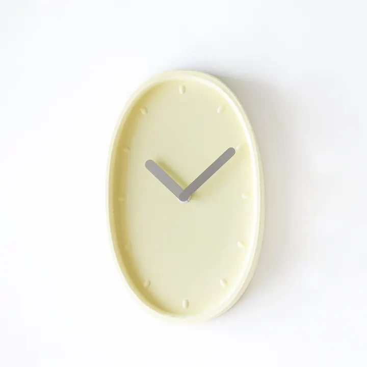 パルプモールドという「紙の立体成型技術」でできた超軽量の時計です。シンプルながら斬新なフォルムで、縦向きでも横向きでも使うことができます。 安定感と潔さが魅力のWhiteと、他のカラーも、染料1滴の濃度にまでこだわって美しい色で表現することができました。 掛け時計といえばありがちな、ビスで壁に大きな穴を開けることもなく押しピンでもしっかり止まります。 インテリアと調和しながらも、美しく柔らかい影がレリーフのように上品な存在感を示します。 *ご購入前にご確認ください 本製品は、デザイン性を重視した楕円形の時計です。一般的な円形時計とは異なり、目盛りの間隔は視覚的なバランスを考慮したデザインとなっていて、おおまかに時間を把握することができます。目盛りはデザインの一部であり、厳密な時間表示を目的としたものではありません。 デザインや色の美しさがインテリアでアクセントになる商品です。あらかじめご了承のうえ、ご購入いただきますようお願いいたします。 ================================================ 大成紙器製作所は、紙の道具「紙器具しきぐ」を提案するブランドです。 古くから日本人にとって紙は、手紙や葉書のように「伝える」のみならず、物を「収める」、 障子やランプシェードのように空間を調整する(設える)など、生活の中に取り入れる文化があります。 「紙器具」とは、紙が私たちの暮らしに寄り添う道具として考え、その価値を再発見し 「伝える・収める・設える」を理念とすることでつくられていく新しい日用品です。