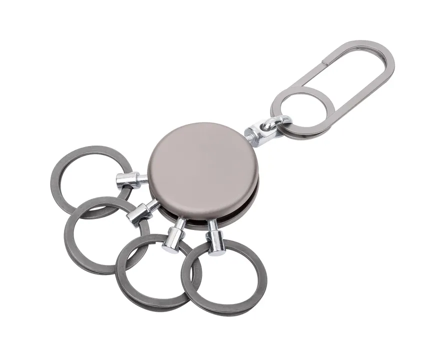 キーリング、ラウンド型、スナップフック付き、4つの取り外し可能なリング、特許取得済みの開閉機構(TROIKA NAIL GUARD)、真鍮、クロムメッキ、マットガンメタル