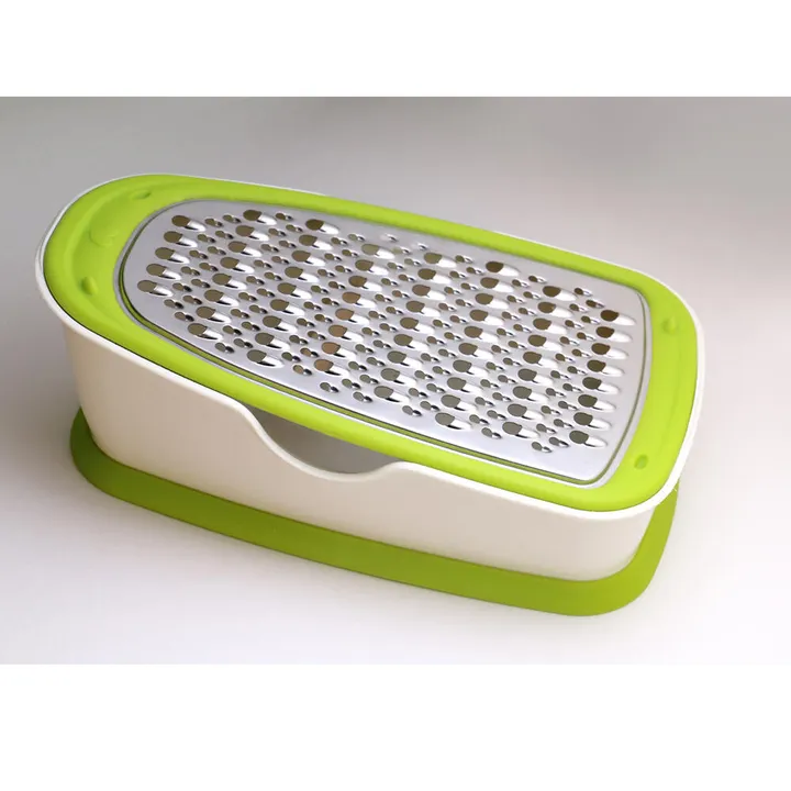 「サラダおろしBOX」は新開発のブレードですりおろすことにより、「簡単に」「非常に軽い力で」「短時間に」均一な野菜の細切りができる、新型おろし金です。姉妹商品「サラダおろし」のBOXタイプ。