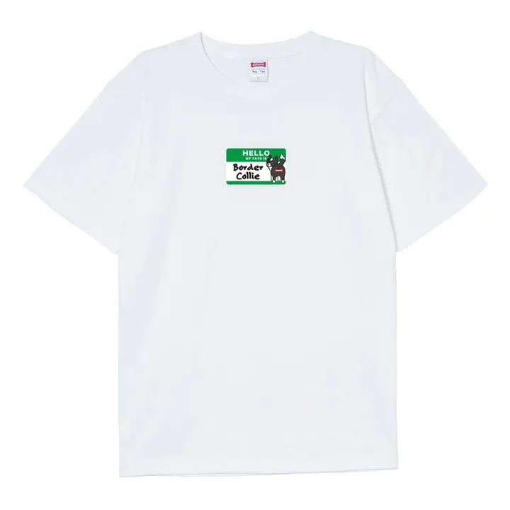 "HELLO MY FAVE IS Border Collie" 「こんにちは。私の推しはボーダーコリーです。」 デザインの元になっているのは海外のパーティーなどで名刺の代わりに使われることが多い、"HELLO MY NAME IS"ステッカー。 はじめましての挨拶に使われるステッカーをデザインに使うことで、Tシャツを着ることで自分のお気に入りのワンちゃんを伝えられればいいなと思い作ったTシャツです。 Tシャツのボディーは、100%コットンで6.2ozの着心地の良い厚めの素材を使用。 首もとの縫製には、ステッチを2本施すことによって首もとの伸びを抑えることができるダブルステッチ縫製を採用。 長い間、着心地良く着ていただける素材を選びました。 このTシャツを着て【ボーダーコリー】好きをアピールしましょう! サイズ展開- S/M/L/XL 身丈- 63/68/72/75 身幅- 47/52/55/60 肩幅- 42/46/50/55 袖丈- 18/22/22/23 素材- 綿100% Printed in JAPAN Illusted by hoppe https://www.instagram.com/hoppe_illust/
