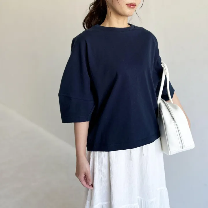 USAコットン ランタンスリーブ プルオーバ ドルマンスリーブで脇と袖に独特な切り替えで立体的なシルエットを出している半袖カットソー ヘビーウェイトのTシャツ生地でさらっとゆったりと着用できます。 シンプルでワンランク上の半袖Tシャツです! 着丈58cm 身巾56cm made in japan USAコットン コットン100% USAコットンの空紡糸をつかって 日本で編みたてられた素材 肌ざわりは乾いたシャリ感があり 適度に厚みがあるしっかりとした生地です。 洗いこむほどに柔らかくなって風合いが出てきます。 コットン100%