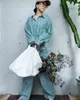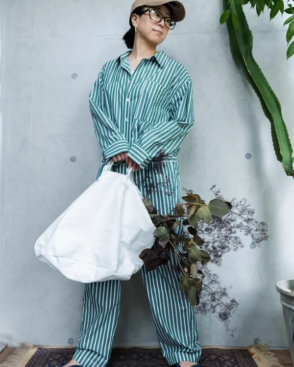 風をはらむほどの体が泳ぐフォルム。 あまった袖の長さやパンツ丈。 アンバランスからの抜け感が成立する服。 -DESIGN- ・第一釦は胸のあたりから始まり、ざっくり開いたVラインがデコルテを生かす。 シルエットはボーイッシュな印象ながらも、計算されたディテールがほのかにセンシュアリティを感じさせる女性だけのマスキュリンスタイル。 ・トップス部分の縦に長いポケットも全体のバランスを良く見せ、縦ラインを強調。 ・ウエストの余りが気になる方は、切り替えベルトの内側でドローストリングで、すっきりさせてください。 更にぎゅっと絞れば、ブラウジングなスタイルに。スタイリッシュな着こなしが完成します。 -TECHNIQUE- ・身長が155cmな小柄な方も、ブラウジングをすることで、着こなすことができます。その際は、袖、裾をロールアップしスッキリみせることをお忘れなく。手首足首を見せることは女性らしさを際立たせる、着こなしテクニックのポイントです。(ブラウジングすることで、気になるお腹やお尻のカバーにもなります。) ・男性は、身長172cmくらいの方までは着用可能。ウエストもゆったりしていますので、歳を重ねた方の気になるお腹も大丈夫。 ルーズなシルエットは、女性が着ればクリーンな色気を。男性が着用すれば、お茶目なキュートさを。 トップス部分を腰に巻いたデザイン性のある着こなしも楽しめます。 -MATERIAL- 独身男性や忙しい女性のため、形態安定加工済みの生地を使用。 洗濯したものに「アイロンがけ」をしなくてもある程度のシワは目立ちません。気になるシワがあれば、蒸気でシュッと。簡単に取れやすいというのが嬉しい。 お家で過ごす時間、もちろんそのまま街着としても楽しめる、そんな日常をボーダーレスに楽しむオールインワン。ニュースタンダードなアイテムとしてご提供します。