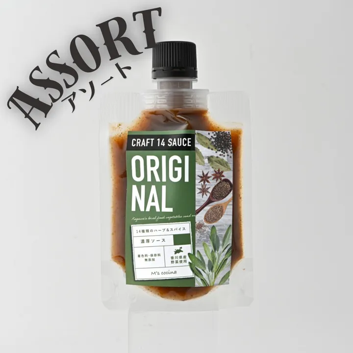 『クラフト14ソース オリジナル』 香川県産の野菜、14種類のハーブとスパイスをふんだんに使った香り高いウスターソース 第15回調味料選手権2024 《ソース部門》 最優秀賞受賞(日本野菜ソムリエ協会主催) 『クラフト14ソース ガーリックストロング』 香川県産の野菜、14種類のハーブとスパイスをふんだんに使い、香川県産の風味豊かなニンニクをオリジナルの10倍使用したニンニク風味のウスターソース。 『クラフト14ソース ホット&スパイシー』 香川県産の野菜、14種類のハーブとスパイスをふんだんに使ったオリジナルの旨味はそのままに、幻のトウガラシ『香川本鷹』の辛味と風味を生かした辛口ウスターソース。 化学調味料、着色料、保存料など不使用。 ひとつひとつ心を込めて手作りしています。 香川県産の新鮮な野菜の旨味とハーブとスパイスの豊かな香りが食欲をそそり、かけるだけでいつもの食卓がワンランクアップ! ウスターソースと同じようにフライものや肉料理などにそのままかけてお召し上がりください。 カレーやミートソースの隠し味としても。 ※原材料は季節、天候や仕入れ状況により、一時的に産地を変更する場合がございます。 【 おすすめ料理 】 ・卵料理に。オムレツやスクランブルエッグ、ゆで卵にそのままかけて。 ・温野菜(特にじゃがいも、かぼちゃ)や蒸し鶏のディップソースとして。 ・バターやケチャップを足して、オリジナルのハンバーグソースに。 ・お好みの調味料(オリーブオイル、マスタード、マヨネーズ)と合わせてオリジナルソースやドレッシングに。 【 製品情報 】 名称:濃厚ソース <オリジナル・ガーリックストロング> 原材料名:香川県産サンマルツァーノトマト、香川県産たまねぎ、香川県産にんじん、香川県産セロリ、砂糖、ワインビネガー、食塩、しょうゆ(小麦、大豆を含む)、昆布、香辛料(香川県産にんにく、香川県産トウガラシ、香川県産ローリエ、ナツメグ、シナモン、クミン、クローブ、セージ、タイム、カルダモン、ブラックペッパー、オールスパイス、スターアニス、フェンネルシード) <ホット&スパイシー> 香川県産サンマルツァーノトマト、香川県産たまねぎ、香川県産にんじん、香川県産セロリ、砂糖、ワインビネガー、食塩、しょうゆ(小麦、大豆を含む)、昆布、香辛料(香川県産にんにく、香川県産トウガラシ(香川本鷹)、香川県産ローリエ、パプリカ、ナツメグ、シナモン、クミン、クローブ、セージ、タイム、カルダモン、ブラックペッパー、オールスパイス、スターアニス) ※原材料は季節、天候や仕入れ状況により、一時的に産地を変更する場合がございます。 内容量:100g 賞味期限:製造日より2年(開封後はお早めにお召し上がりください) 保存方法:直射日光および高温多湿を避けて常温で保存してください。開封後も常温可(温度が低くなると沈殿しやすくなります) ※安定剤や増粘剤を使っていないため、沈殿・分離などしますので、よく振ってお使いください。 ※内容物に材料の繊維、トマトの種などが残っていますが、品質に問題ありません。 ※注ぎ口に固まることがあります。固まったものを食べても問題ありません。 製造者:M's cocina 栄養成分表示(100gあたり) <オリジナル> エネルギー 87kcal たんぱく質 1.6g 脂質 0.1g 炭水化物 19.8g 食塩相当量 3.5g <ガーリックストロング> エネルギー 101kcal たんぱく質 1.8g 脂質 0.1g 炭水化物 23.3g 食塩相当量 3.3g <ホット&スパイシー> エネルギー 103kcal たんぱく質 1.5g 脂質 0.1g 炭水化物 24.1g 食塩相当量 3.3g